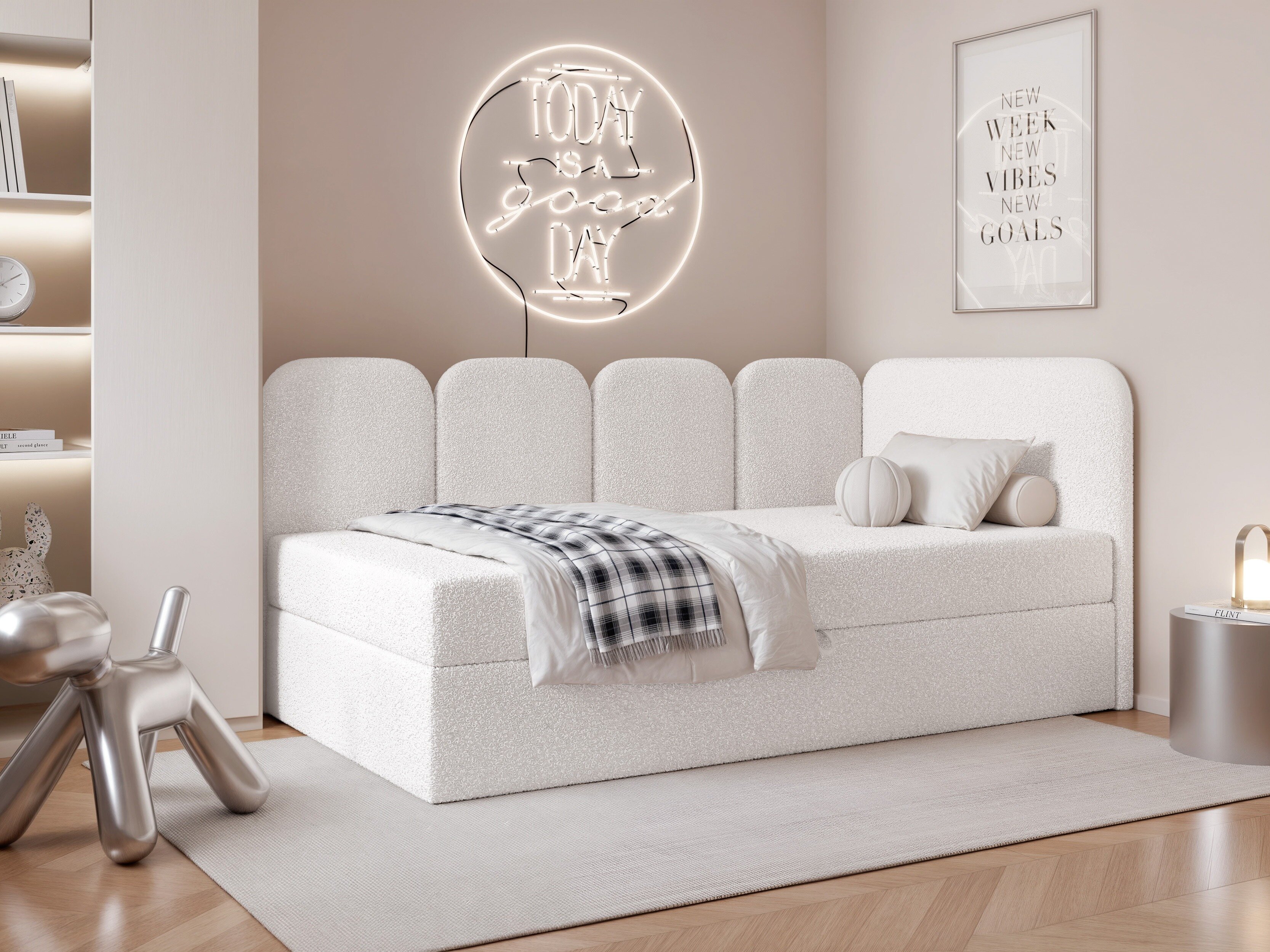 Der „Boucle“-Stoff (Bouclé) zeichnet sich durch sein einzigartiges Strukturmuster aus, das durch unterschiedlich große Schlaufen und Knoten entsteht. Diese Besonderheit verleiht den Möbeln einen außergewöhnlichen Charakter und ein angenehmes Gefühl. Die Oberfläche des Stoffes kann weich oder wollähnlich sein. Dank seiner robusten Struktur ist der Stoff sehr formbeständig, wodurch er zu einem idealen Material für Sofas, Sessel und andere Möbelstücke wird. Wenn Sie einen raffinierten und modernen Raum schaffen wollen, ist dieser Stoff die perfekte Wahl.