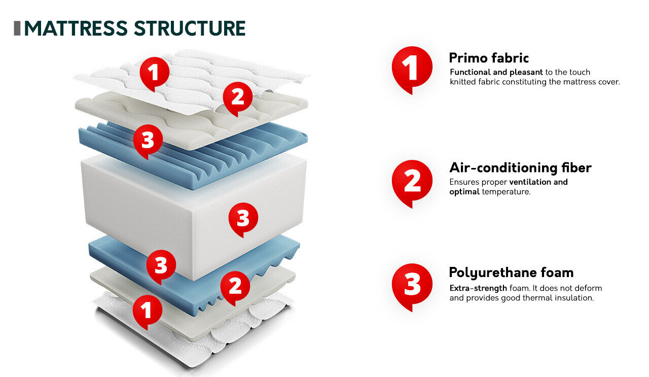 Der Unterbau der Matratze ist so konzipiert, dass das Körpergewicht gleichmäßig verteilt wird und sich der Körper vollständig entspannen kann. Es werden zwei unterschiedlich weiche Füllungen verwendet, um die Härtezonen zu betonen. Die am stärksten belasteten Matratzenbereiche wie Schultern, Gesäß und Waden sind weicher. Und die Bereiche in der Nähe des Kopfes, der Taille, der Oberschenkel und der Füße sind härter. Diese Verteilung ermöglicht es, die richtige Position der Wirbelsäule beizubehalten und die Muskelentspannung zu maximieren.