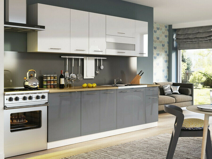 Die Modulküchenmöbelkollektion ist eine ausgezeichnete Wahl für alle, die individuelle Lösungen für ihren Küchenraum suchen. Diese Kollektion umfasst eine Vielzahl von bodenstehenden und wandhängenden Schränken, und Sie können auch aus mehreren vorgefertigten Küchensets wählen. Die glänzenden Fronten verleihen Ihrer Küche einen modernen und ästhetischen Touch, während die verschiedenen Farboptionen es Ihnen ermöglichen, die Schränke mit verschiedenen Einrichtungsstilen zu kombinieren. Metallgriffe und gehärtetes Glas ergänzen das Design der Schränke und verleihen ihnen eine moderne Ausstrahlung. Durch die verstellbaren Füße können die Schränke leicht an unebene Böden angepasst werden, was Stabilität und Funktionalität gewährleistet.