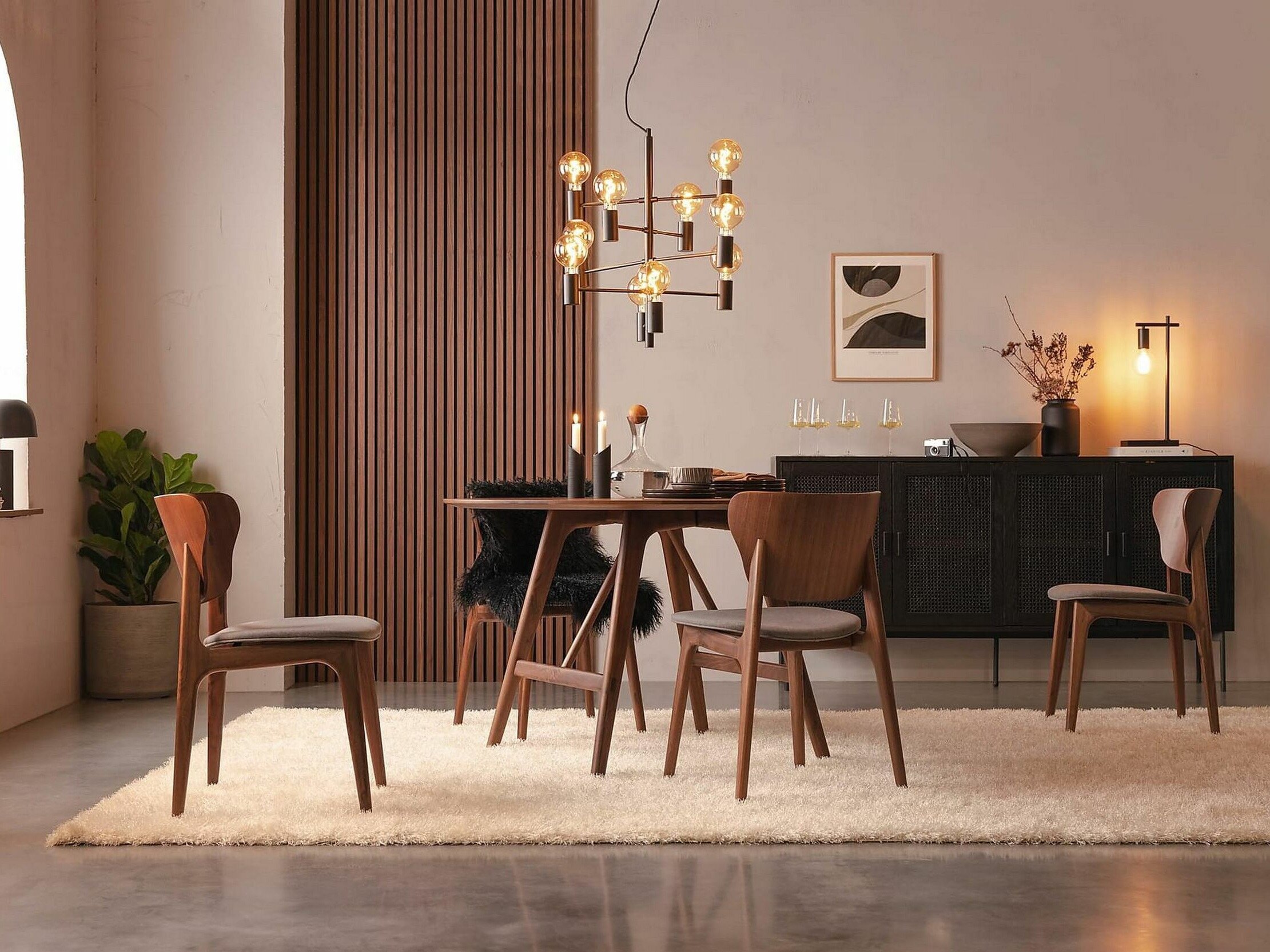 Diese einzigartige Kollektion stützt sich auf den skandinavischen, von den 50er und 60er Jahren inspirierten Stil. Modern, zeitgemäß und zeitlos. Ihre Hauptmerkmale sind klare Farben, schräge Ecken und Holzdetails. Eichen- oder Nussbaumholzoptik sind die Hauptbestandteile dieser Kollektion, aus denen der Korpus der Möbel gefertigt wird. Bei der Herstellung der Möbel werden Naturholzplatten und Holzbeine verwendet, so dass die Möbel widerstandsfähig und langlebig sind. Versteckte Griffe, die in die Türen geschnitten werden, verleihen dem Bild Integrität, ohne dass die Möbel ihre Funktionalität und ihren Komfort verlieren. Das Möbelset verfügt über mehrfarbige Schubladendekorationen, die es ermöglichen, einfarbige oder kombinierte Gestaltungsmöglichkeiten zu wählen. Durch den Wechsel der Dekoration kann man das Aussehen der Möbel anpassen und das Bild des Hauses erneuern, ohne die Möbel selbst zu verändern.