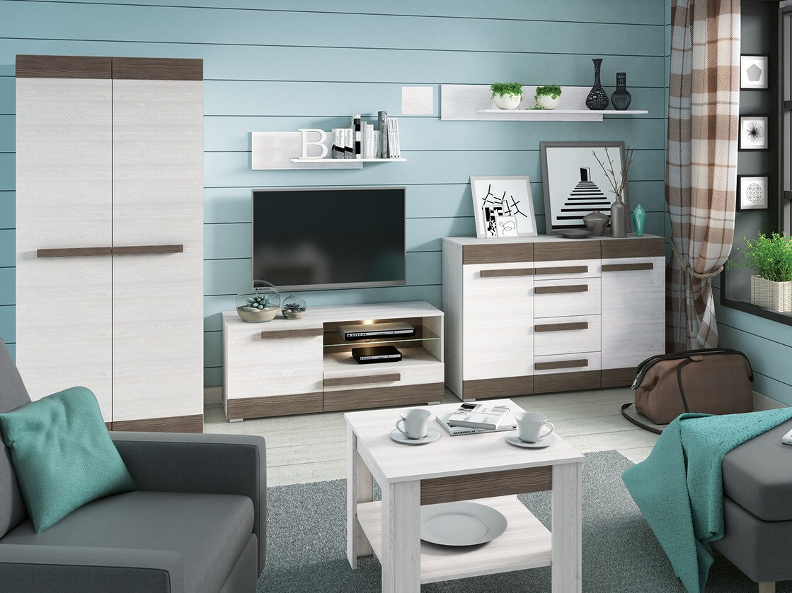 Wenn Sie eine vielseitige Möbelkollektion suchen, die für verschiedene Räume im Haus geeignet ist, ist diese Kollektion genau das Richtige. Die Stücke aus dieser Kollektion eignen sich für Wohnzimmer, Schlafzimmer, Flur oder Kinderzimmer. Der Fokus dieser Kollektion liegt auf Komfort und schönem Design, das sich an unterschiedliche Geschmäcker anpassen lässt. Die Kombination aus gebleichtem Kiefernholz und grauen Farben ist vielseitig und lässt sich leicht kombinieren. Die Möbeloberflächen sind resistent gegen leichte Kratzer und ihre Kanten sind mit einem speziellen ABS-Streifen geschützt, sodass Sie sich keine Sorgen über einen schnellen Verschleiß machen müssen. Die Möbel sind mit Kunststoffbeinen und -griffen ausgestattet, die sich nahtlos in das Gesamtdesign einfügen, ohne es zu überfordern. Die Vitrinenstücke bestehen aus gehärtetem Glas, das haltbarer und sicherer als normales Glas ist. Ein praktisches und universelles Merkmal der Möbel ist, dass die Türen sowohl auf der rechten als auch auf der linken Seite montiert werden können. Darüber hinaus bieten die Möbel sowohl geschlossene als auch offene Stauräume und helfen so bei der organisierten Aufbewahrung von Gegenständen. Wer seiner Inneneinrichtung mehr Einzigartigkeit verleihen möchte, kann für diese Stücke zusätzlich eine energiesparende LED-Beleuchtung bestellen.