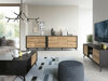 Die Möbel dieser Kollektion passen zu vielen Einrichtungsstilen, aber am besten zu modernen oder industriell geprägten Wohnungseinrichtungen. Das einzigartige Möbeldesign zeigt sich in der Kombination aus schwarzen Metallbeinen und hellen Fronten in Eichenholzoptik. Ein exklusives Muster aus geometrischen Formen verleiht dem Raum Authentizität und moderne Züge.