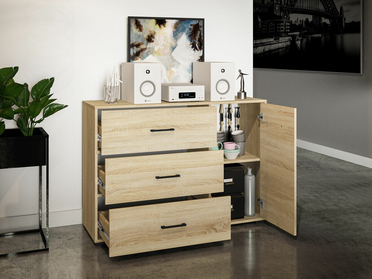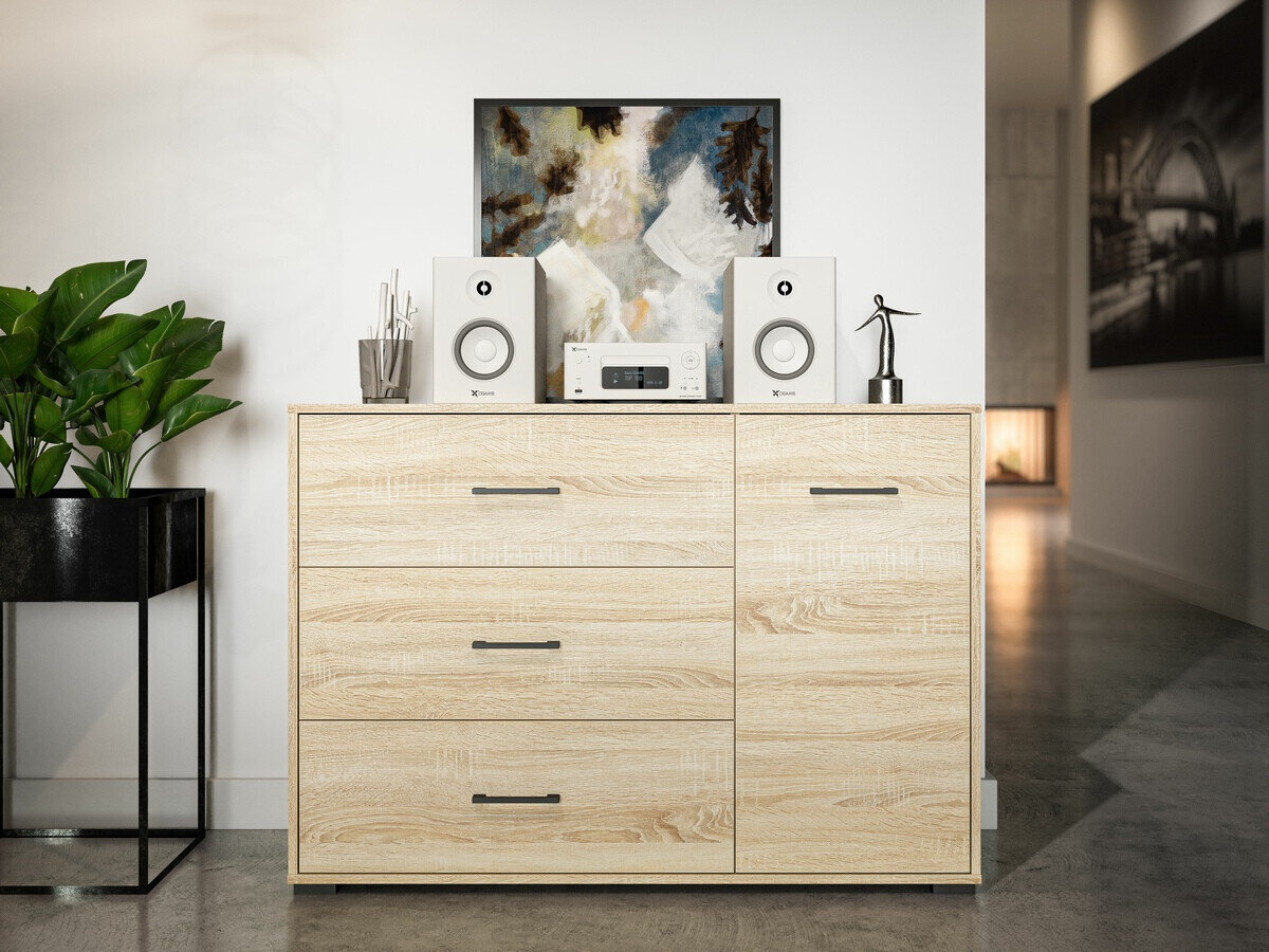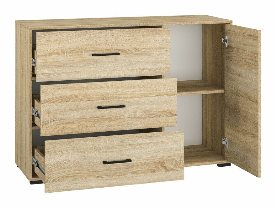 Das ist eine Kollektion, die sich auf Einfachheit und Zweckmäßigkeit konzentriert. Eines der wichtigsten Highlights der Kollektion sind die minimalistischen Kunststoffgriffe. Sie sorgen nicht nur für eine bequeme Nutzung der Möbel, sondern fügen sich auch harmonisch in das Gesamtdesign ein und sorgen für einen sauberen und modernen Look. Jedes Stück dieser Kollektion wird mit besonderem Augenmerk auf den Kantenschutz hergestellt. Dies bedeutet, dass Sie Ihre Möbel genießen können, ohne sich um schnelle Abnutzung sorgen zu müssen, was Sicherheit und Langlebigkeit gewährleistet. Die Möbel dieser Kollektion haben eine zeitlose und vielseitige Ästhetik, die gut zu einer Vielzahl von Einrichtungsstilen passt. Egal, ob Ihr Zuhause zeitgenössisch, modern oder sogar klassisch ist, diese Kollektion passt sich leicht an und verleiht dem Raum einen einzigartigen Charme. Werten Sie Ihr Zuhause mit diesen stilvollen Möbelstücken auf, die nicht nur Ihren ästhetischen Bedürfnissen entsprechen, sondern auch lang anhaltenden Komfort und Funktionalität bieten.