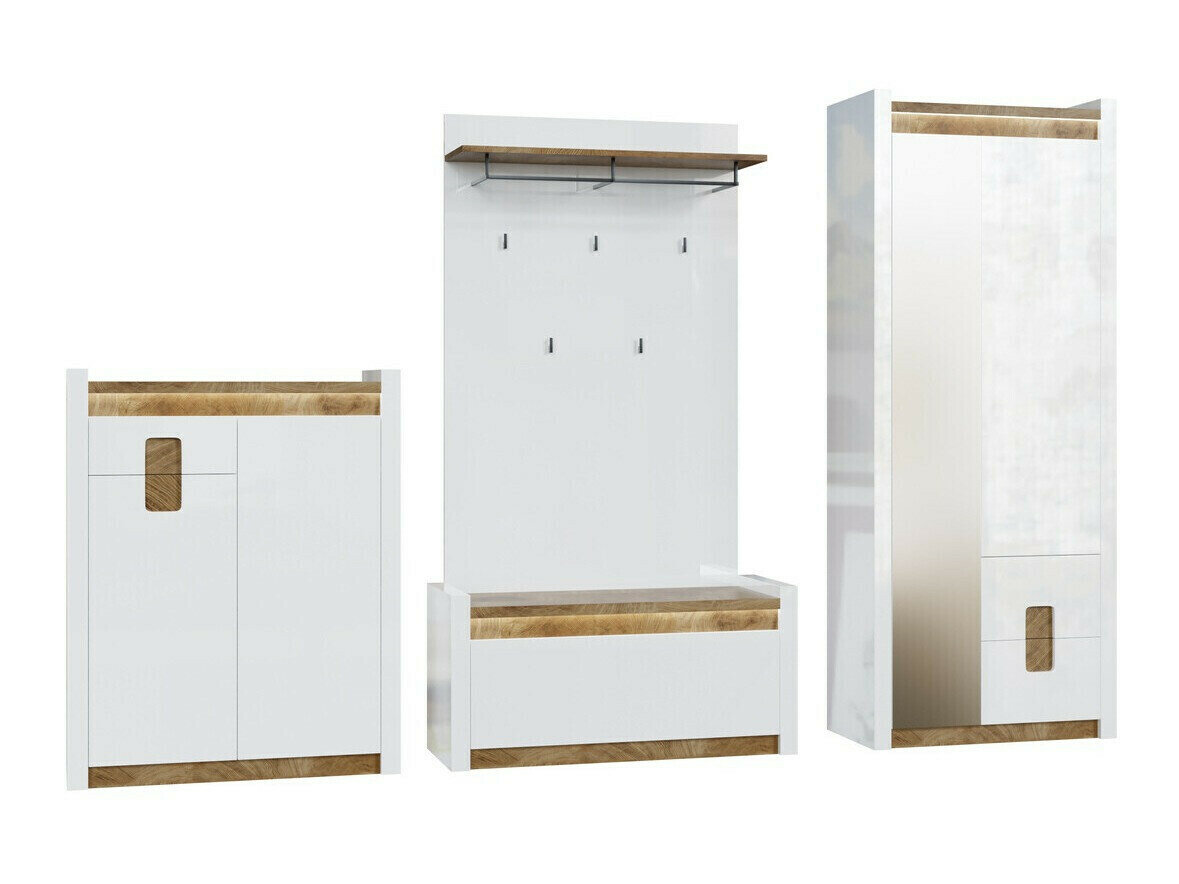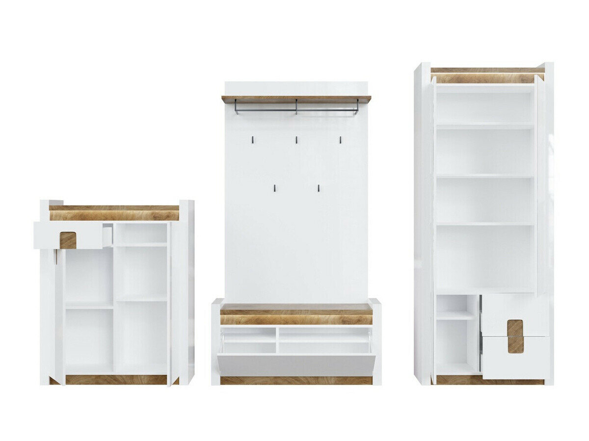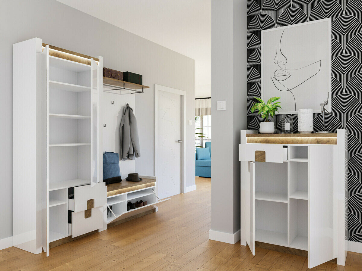 Ein wichtiger Schritt bei der Einrichtung des Hauses ist die Entscheidung, welche Stimmung wir schaffen wollen. Achten Sie auf die Farbe: Helle Farben vergrößern den Raum optisch, dunkle Farben bewirken das Gegenteil, sie verkleinern ihn. Holzfarbene Details verleihen Komfort und sehen im Innenraum gut aus. Diese Möbelkollektion ist einzigartig, da sie eine große Auswahl an Möbelmodellen für verschiedene Wohnbereiche bietet. Schaffen Sie sowohl im Wohnzimmer als auch im Schlafzimmer eine solide Einrichtung. Wie wäre es, wenn die Möbel auch in den Flur passen? Oder ins Büro? All das ist mit dieser Kollektion möglich. Die helle Farbpalette sieht sowohl in kleinen als auch in großen Räumen gut aus. Die Möbelfronten werden von glänzendem Weiß dominiert, das durch holzfarbene Details perfekt ergänzt wird. Die Farbe und die Muster des Holzes kommen bei den Tischen wunderbar zur Geltung und vermitteln ein Gefühl der Gemütlichkeit. Auch die Grifflösung fällt ins Auge, die nicht nur als Griffe, sondern auch als Dekor dient. Stauraum gibt es auf jeden Fall genug, die Möbel verfügen über zahlreiche Schubladen und Ablagen. Für zusätzlichen Charme sorgt die integrierte energiesparende LED-Beleuchtung. Mit dieser Lösung genießen Sie gemütliches Licht, das die holzfarbenen Einsätze hervorhebt. Der geräuschlose Schließmechanismus schützt die Türen und Schubladen vor dem schnellen Schließen.