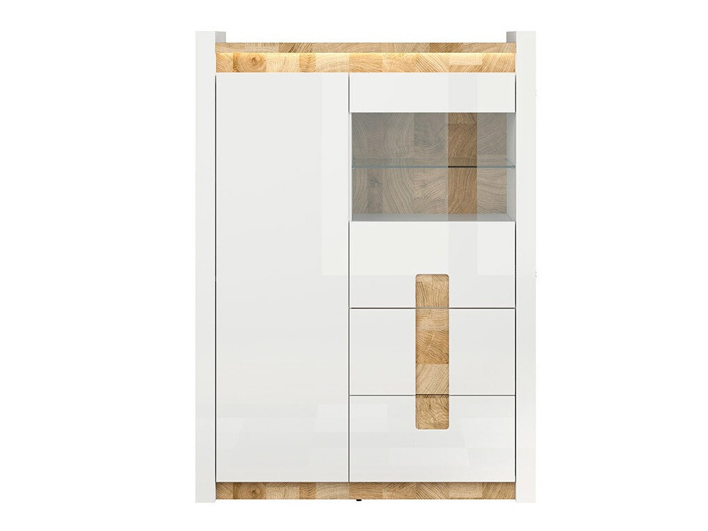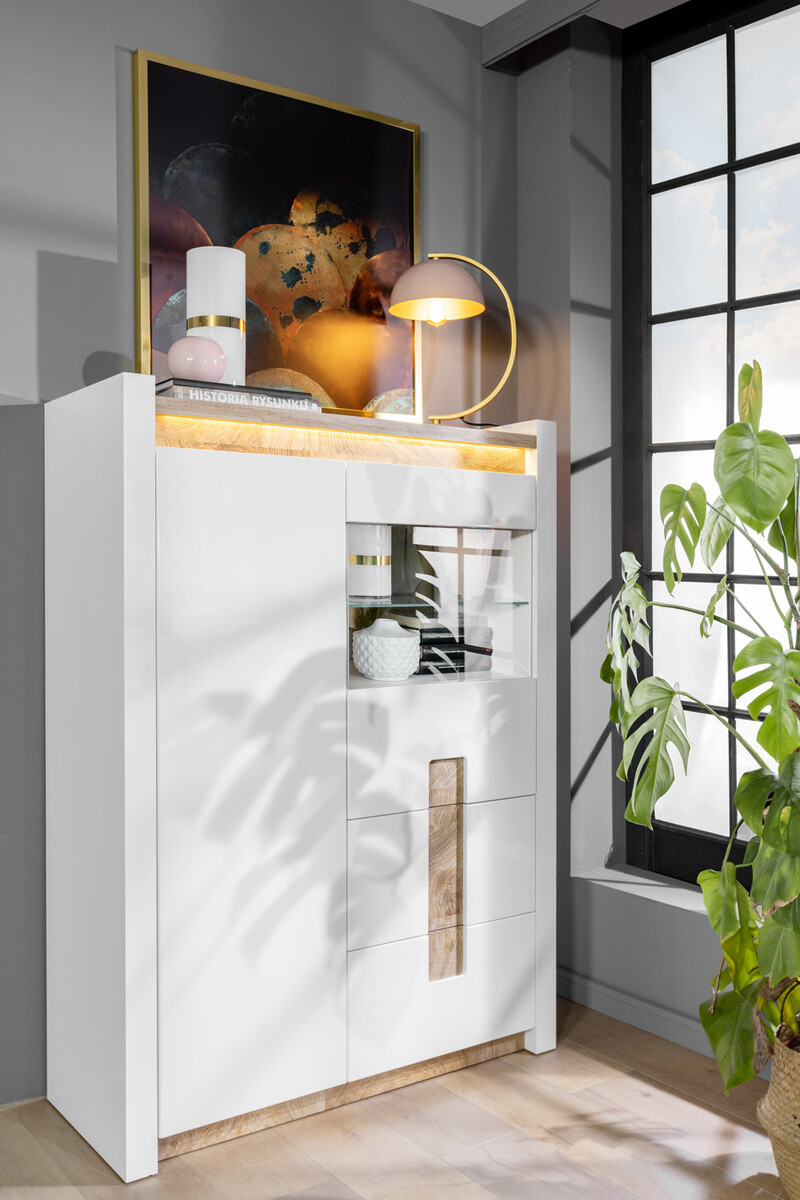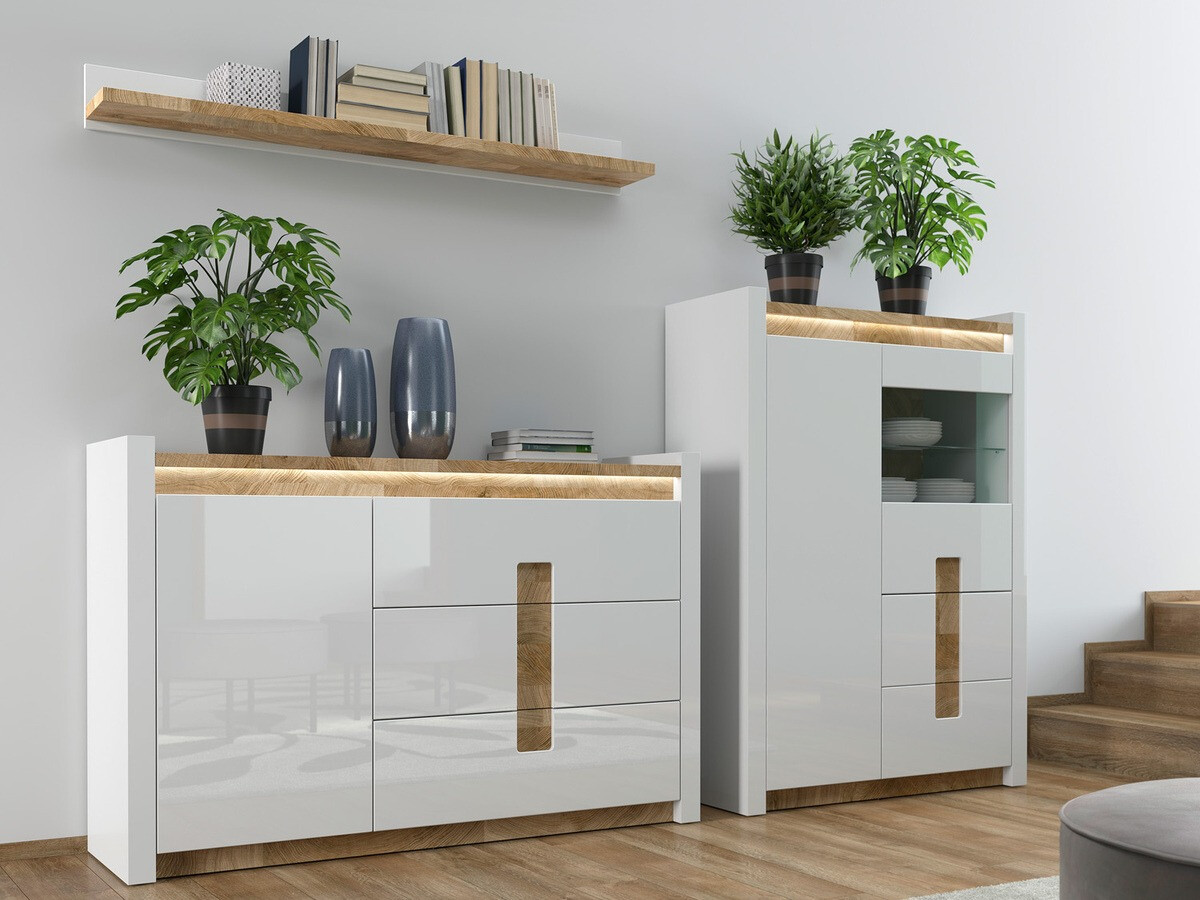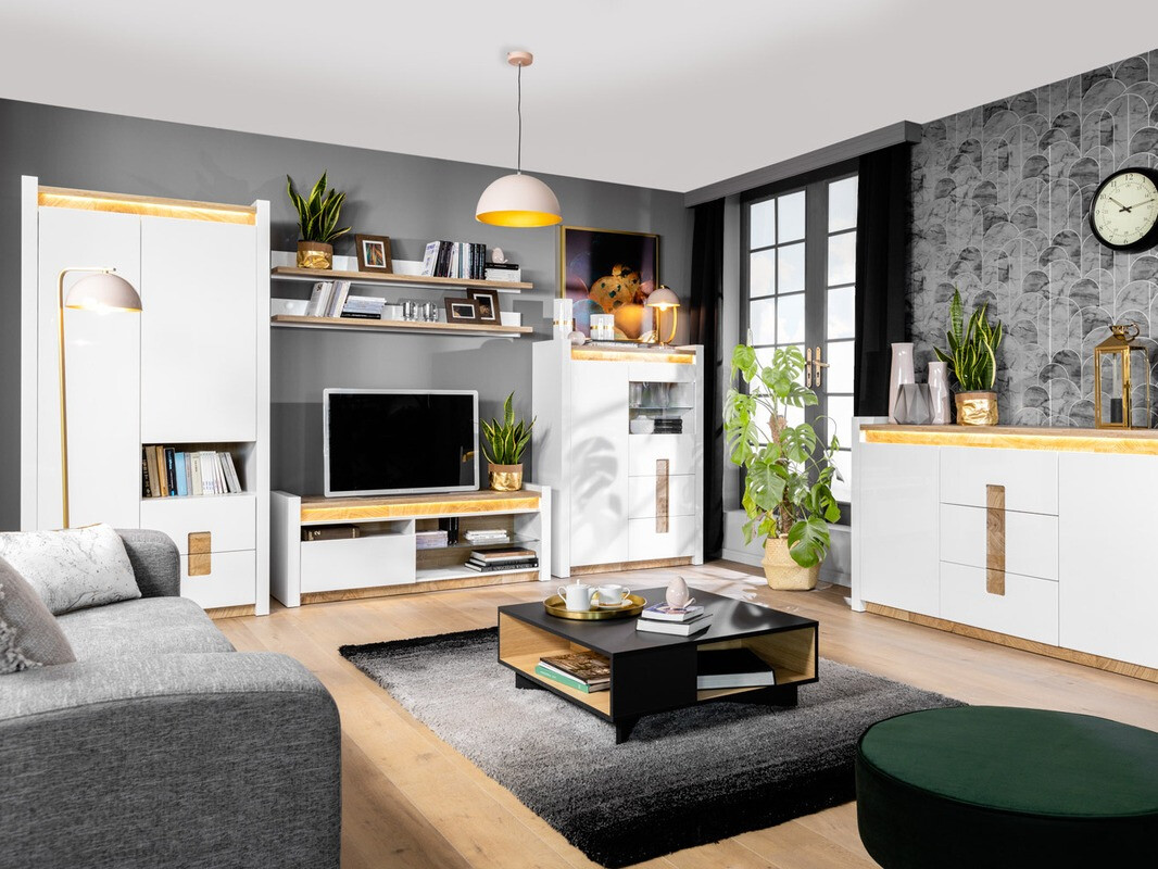 Ein wichtiger Schritt bei der Einrichtung des Hauses ist die Entscheidung, welche Stimmung wir schaffen wollen. Achten Sie auf die Farbe: Helle Farben vergrößern den Raum optisch, dunkle Farben bewirken das Gegenteil, sie verkleinern ihn. Holzfarbene Details verleihen Komfort und sehen im Innenraum gut aus. Diese Möbelkollektion ist einzigartig, da sie eine große Auswahl an Möbelmodellen für verschiedene Wohnbereiche bietet. Schaffen Sie sowohl im Wohnzimmer als auch im Schlafzimmer eine solide Einrichtung. Wie wäre es, wenn die Möbel auch in den Flur passen? Oder ins Büro? All das ist mit dieser Kollektion möglich. Die helle Farbpalette sieht sowohl in kleinen als auch in großen Räumen gut aus. Die Möbelfronten werden von glänzendem Weiß dominiert, das durch holzfarbene Details perfekt ergänzt wird. Die Farbe und die Muster des Holzes kommen bei den Tischen wunderbar zur Geltung und vermitteln ein Gefühl der Gemütlichkeit. Auch die Grifflösung fällt ins Auge, die nicht nur als Griffe, sondern auch als Dekor dient. Stauraum gibt es auf jeden Fall genug, die Möbel verfügen über zahlreiche Schubladen und Ablagen. Für zusätzlichen Charme sorgt die integrierte energiesparende LED-Beleuchtung. Mit dieser Lösung genießen Sie gemütliches Licht, das die holzfarbenen Einsätze hervorhebt. Der geräuschlose Schließmechanismus schützt die Türen und Schubladen vor dem schnellen Schließen.