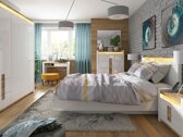 Ein wichtiger Schritt bei der Einrichtung des Hauses ist die Entscheidung, welche Stimmung wir schaffen wollen. Achten Sie auf die Farbe: Helle Farben vergrößern den Raum optisch, dunkle Farben bewirken das Gegenteil, sie verkleinern ihn. Holzfarbene Details verleihen Komfort und sehen im Innenraum gut aus. Diese Möbelkollektion ist einzigartig, da sie eine große Auswahl an Möbelmodellen für verschiedene Wohnbereiche bietet. Schaffen Sie sowohl im Wohnzimmer als auch im Schlafzimmer eine solide Einrichtung. Wie wäre es, wenn die Möbel auch in den Flur passen? Oder ins Büro? All das ist mit dieser Kollektion möglich. Die helle Farbpalette sieht sowohl in kleinen als auch in großen Räumen gut aus. Die Möbelfronten werden von glänzendem Weiß dominiert, das durch holzfarbene Details perfekt ergänzt wird. Die Farbe und die Muster des Holzes kommen bei den Tischen wunderbar zur Geltung und vermitteln ein Gefühl der Gemütlichkeit. Auch die Grifflösung fällt ins Auge, die nicht nur als Griffe, sondern auch als Dekor dient. Stauraum gibt es auf jeden Fall genug, die Möbel verfügen über zahlreiche Schubladen und Ablagen. Für zusätzlichen Charme sorgt die integrierte energiesparende LED-Beleuchtung. Mit dieser Lösung genießen Sie gemütliches Licht, das die holzfarbenen Einsätze hervorhebt. Der geräuschlose Schließmechanismus schützt die Türen und Schubladen vor dem schnellen Schließen.