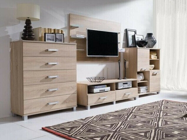 Die Vorderseite und die Seitenflanken der Möbel sind aus laminierten Spanplatten gefertigt, die sich durch ihre Langlebigkeit und gute Verarbeitung auszeichnen. Die Kanten der Möbelplatten sind mit einem speziellen ABS-Band geschützt, das aus starkem Kunststoff besteht und die Kanten vor Abnutzung schützt.