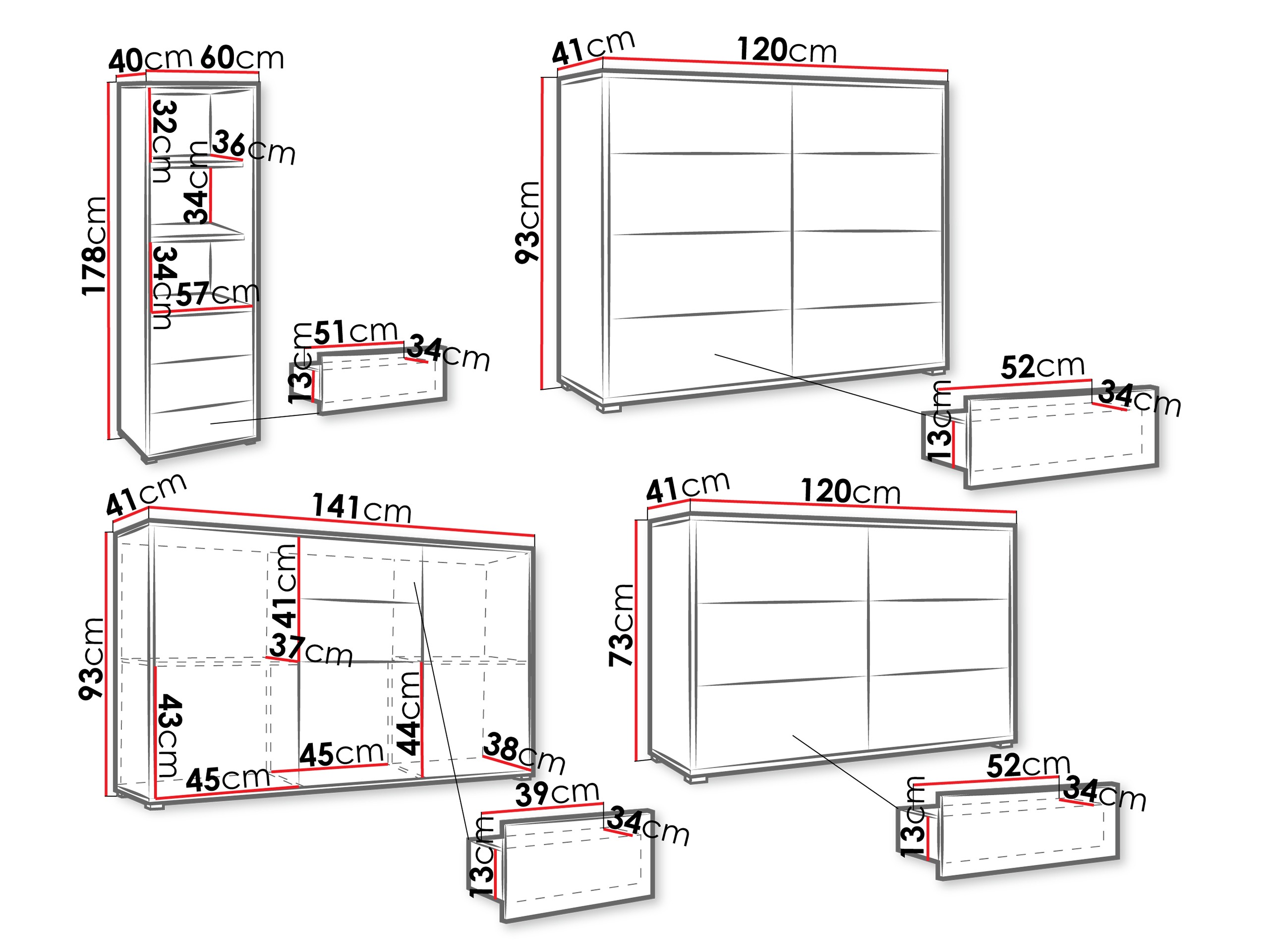 93 x 141 x 41; 73 x 120 x 41; 93 x 120 x 41 cm