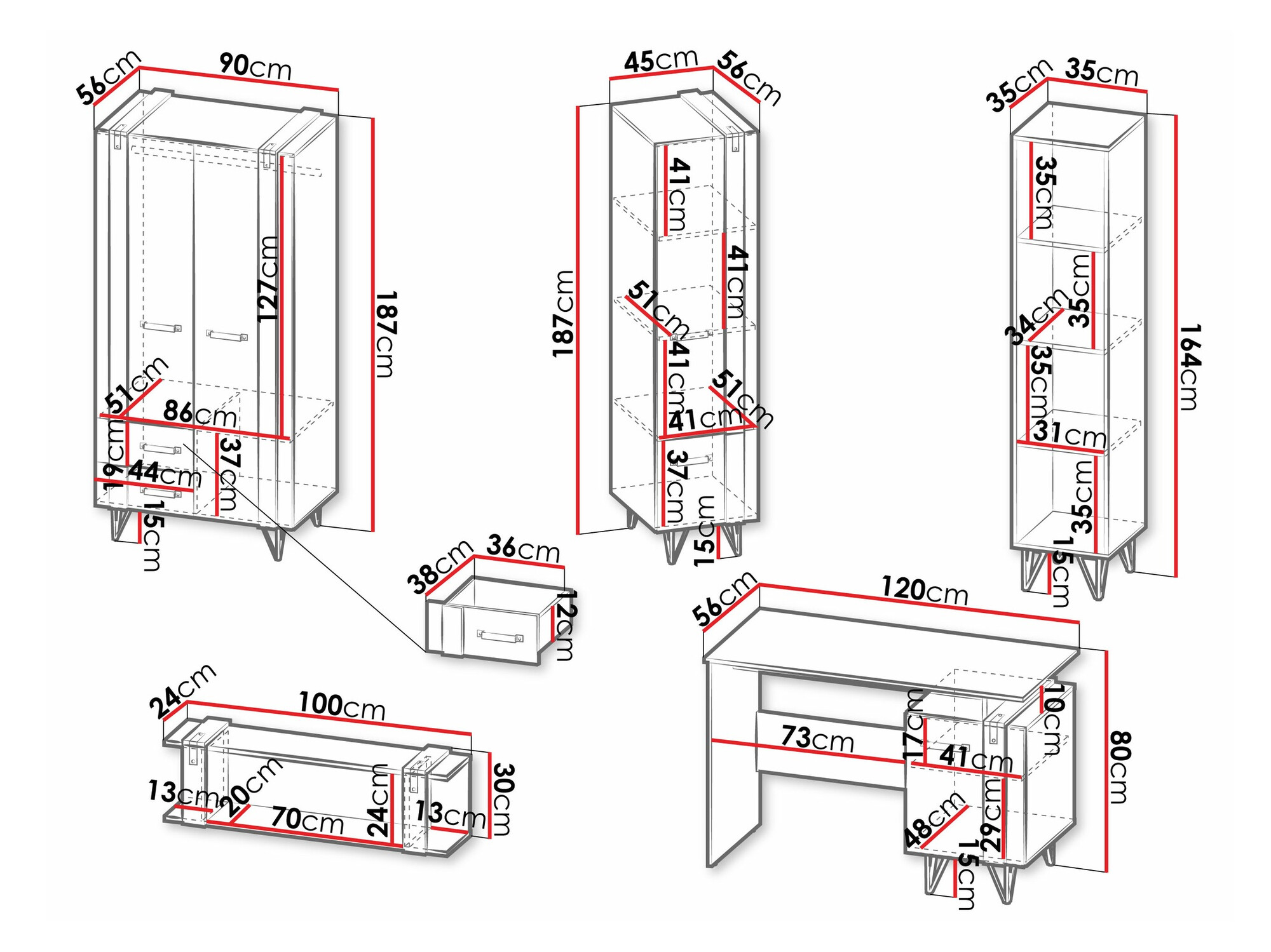 187 x 45 x 56; 164 x 35 x 35 cm