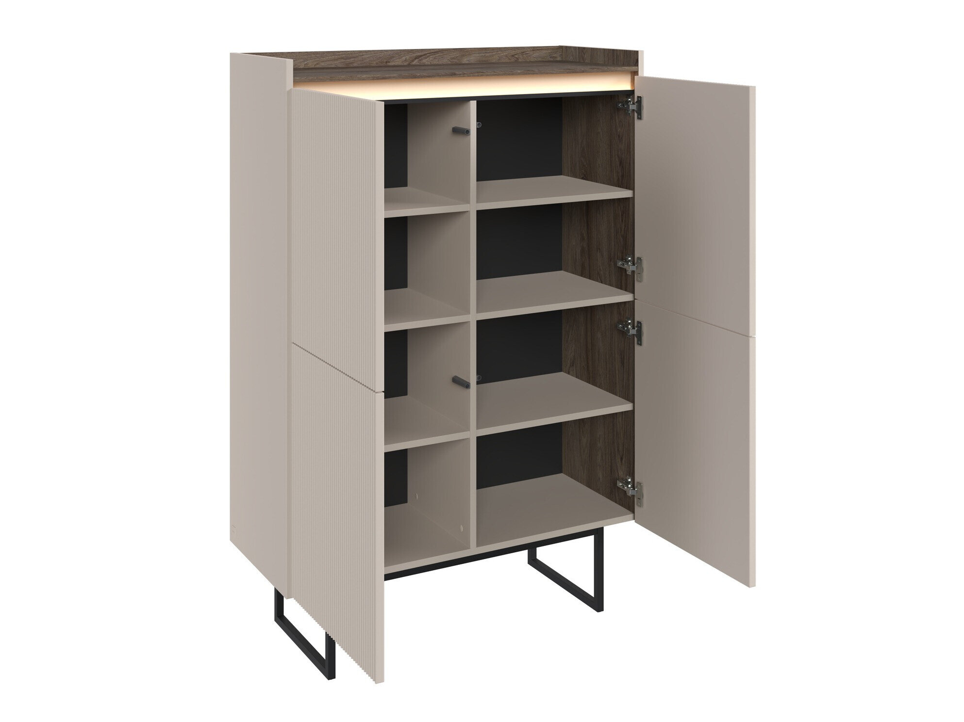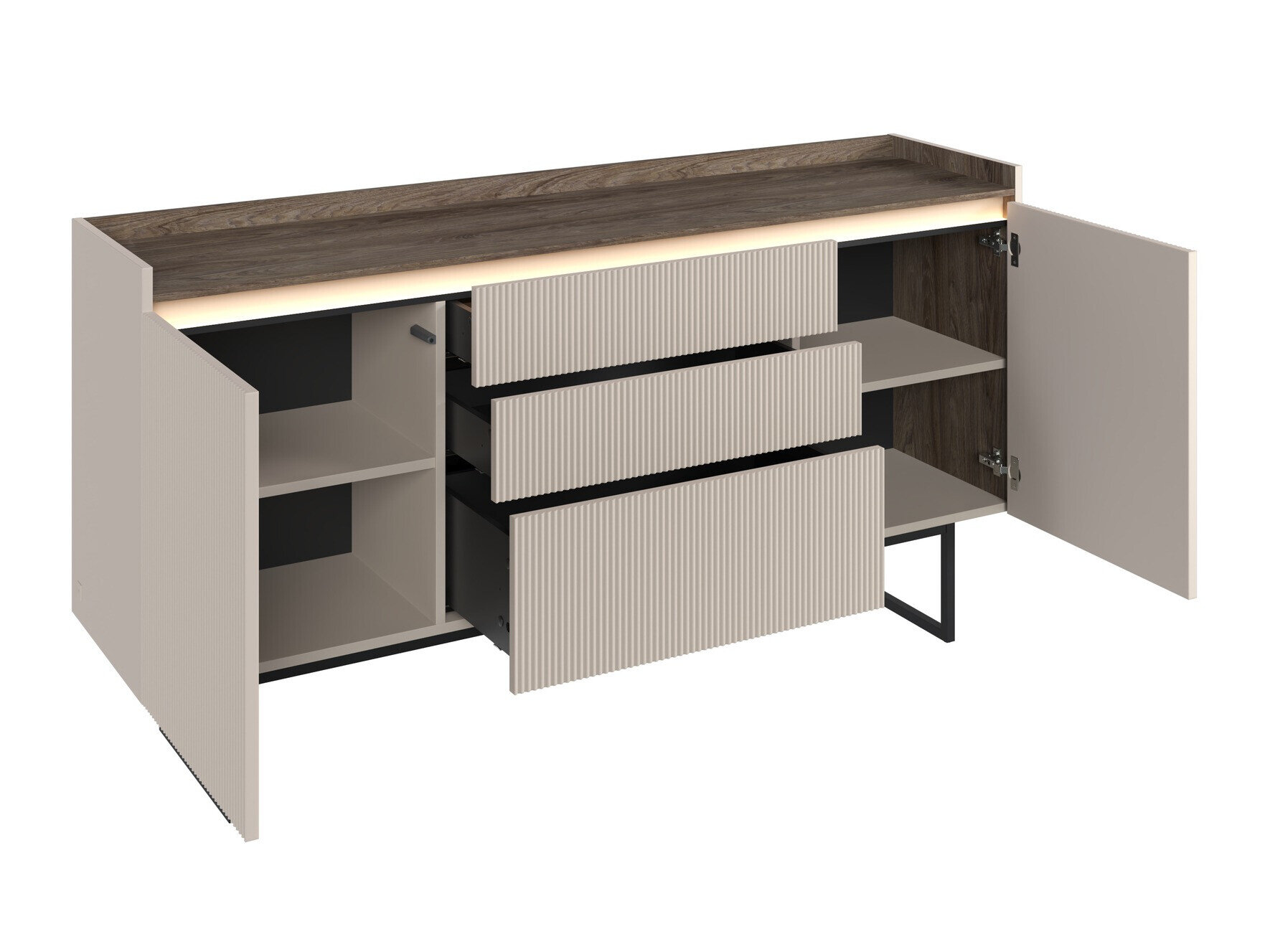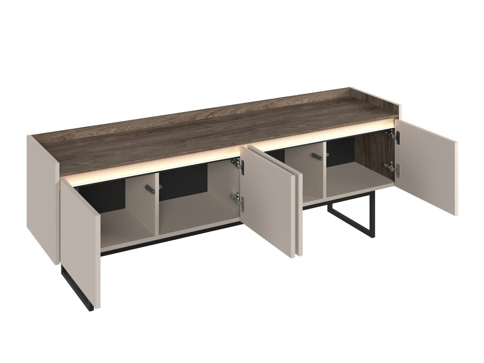 Wir präsentieren eine exklusive Möbelkollektion, die Luxus und Modernität vereint. Diese Kollektion zeichnet sich durch eine luxuriöse Farbkombination aus „Beige“ und dunkler Eiche aus, ergänzt durch stilvolle Metallbeine. Der innovative Türöffnungsmechanismus „Push to Open“ sorgt für Komfort und ein modernes Aussehen, während die zart geriffelten Fronten der Möbel Exklusivität und Eleganz verleihen. Energiesparende LED-Beleuchtung sorgt für eine sanfte Lichtquelle, die eine gemütliche Atmosphäre schafft, und die MDF-Möbelplatte garantiert die Haltbarkeit und Festigkeit der Möbel. Die Möbel sind an den Roboterstaubsauger angepasst, sodass Ihr Zuhause ohne zusätzlichen Aufwand immer aufgeräumt ist. Diese Kollektion ist für diejenigen gedacht, die außergewöhnliches Design und moderne Funktionalität schätzen. Sie verleiht Ihrem Zuhause unvergleichlichen Komfort und Stil.