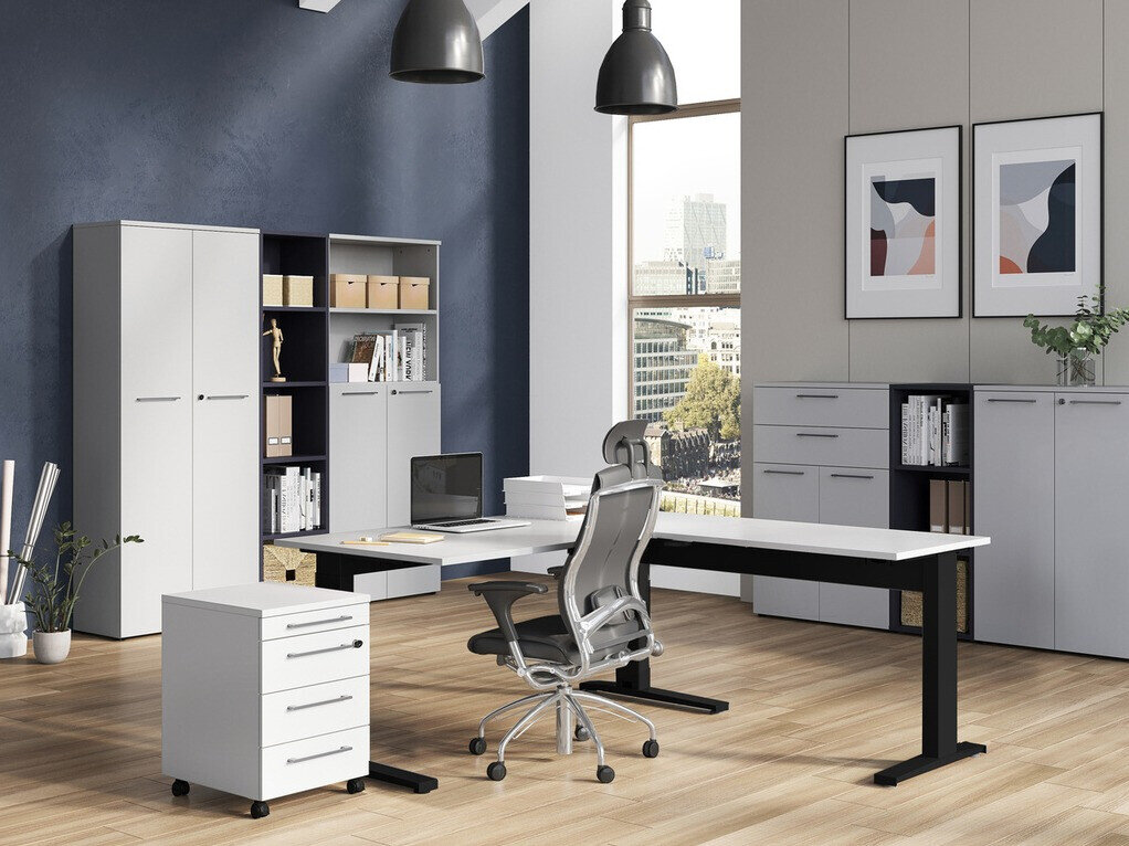 Die Kollektion moderner Designmöbel wird jeden Fan von minimalistischem Design begeistern. Bei dieser Möbelkollektion können Sie aus mehreren Farbvarianten wählen. Die hellgraue Möbelserie wird diejenigen erfreuen, die ein helles Wohndesign mögen, und die Möbel in der Eichenholzoptik „Grandson“, ergänzt durch die Farbe Graphit, werden die Liebhaber von Natürlichkeit begeistern. Diese Möbelkollektion wird durch Metallgriffe ergänzt, die dem Innenraum Leichtigkeit verleihen. Die Möbel sind leicht zu pflegen, da sie mit einem farblosen Material überzogen sind, das sie vor kleinen Kratzern schützt und eine einfache Reinigung von angesammeltem Schmutz ermöglicht. Diese Kollektion verfügt außerdem über kunststoffgeschützte Kanten, die aus stoßfesten Materialien hergestellt sind. Die Schubladen und Türen sind mit einem geräuschlosen Schließmechanismus ausgestattet, der verhindert, dass sie sich schnell schließen. Funktionalität und Komfort sind wesentliche Merkmale dieser in Deutschland hergestellten Kollektion. Die Schränke ermöglichen es Ihnen, die bequemste Art der Aufbewahrung zu wählen, eine abschließbare Schublade sorgt für Privatsphäre, und ein höhenverstellbarer Tisch trägt dazu bei, einen komfortablen Arbeitsplatz zu schaffen. Diese Möbelkollektion wird Ihnen helfen, eine moderne Arbeitsumgebung zu schaffen.