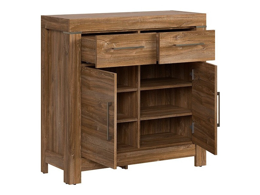 Die Schlichtheit, die exklusiven Formen und die satten Farben der Fronten dieser Möbelkollektion fügen sich perfekt in eine Vielzahl von Innenräumen ein und sprechen sowohl Liebhaber des klassischen als auch des exklusiven Designs an. Die Möbelfronten zeigen ein deutlich sichtbares Holzdekor, das zusammen mit der Farbe der Eichenholzoptik „Stirling“ dem Haus Gemütlichkeit und Wärme verleiht, und das Ganze wird ästhetisch durch komfortable Metallgriffe ergänzt. Dank des breiten Sortiments können diese modularen Möbel in einer Vielzahl von Räumen im Haus erfolgreich eingesetzt und miteinander kombiniert werden, so dass Kombinationen entstehen, die den individuellen Bedürfnissen entsprechen. Die Innenräume der Schränke und Schubladen sind geräumig genug, um eine effiziente Aufbewahrung verschiedener Gegenstände zu gewährleisten, während die LED-Beleuchtung in den Vitrinen, Hängeregalen, TV-Tischen und Regalen einen Hauch von Romantik vermittelt. Die Vitrinen dieser Kollektion sind mit gehärtetem Glas ausgestattet, das eine viel höhere Festigkeit als gewöhnliches Glas aufweist. Die Möbelkollektion verfügt über einen geräuschlosen Schließmechanismus, der für mehr Komfort sorgt und es Ihnen ermöglicht, zusätzliche Geräusche bei der Verwendung von Schubladen oder Schränken zu vermeiden.
