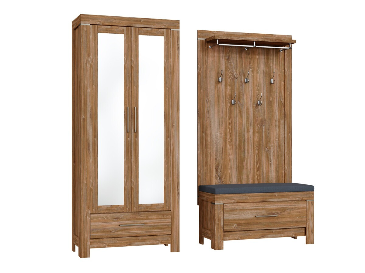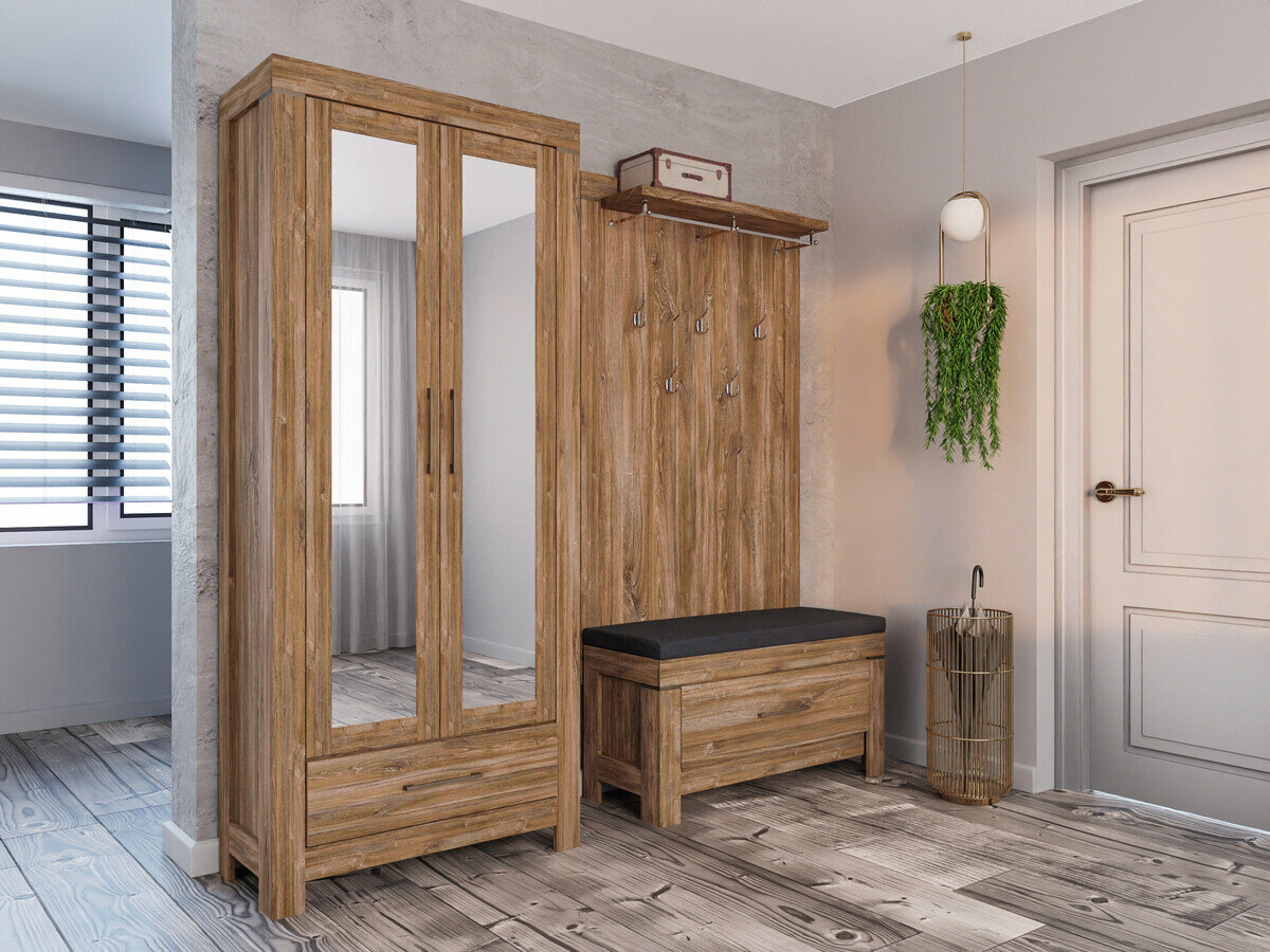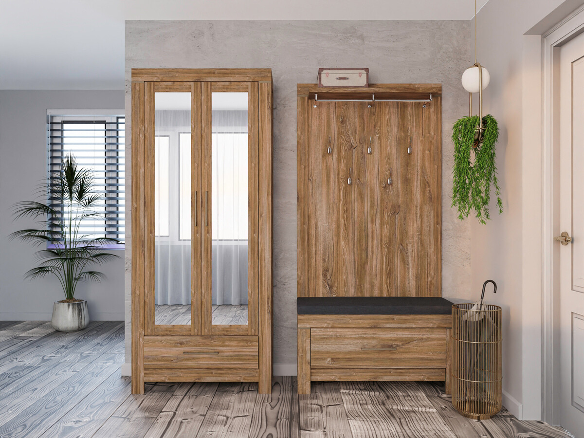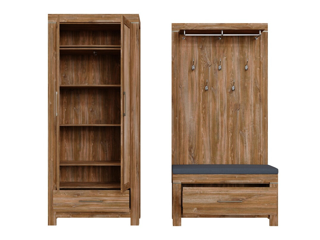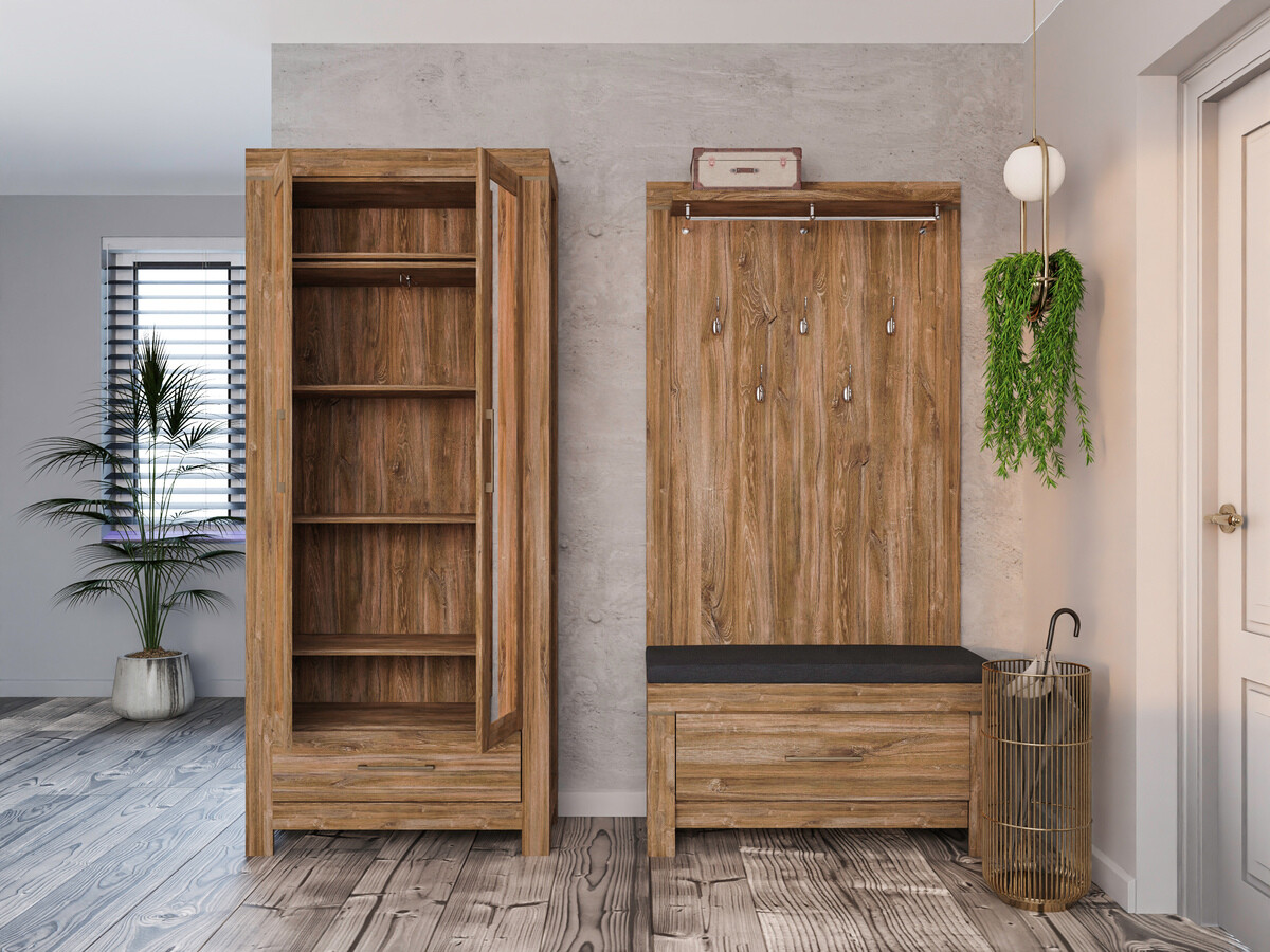 Die Schlichtheit, die exklusiven Formen und die satten Farben der Fronten dieser Möbelkollektion fügen sich perfekt in eine Vielzahl von Innenräumen ein und sprechen sowohl Liebhaber des klassischen als auch des exklusiven Designs an. Die Möbelfronten zeigen ein deutlich sichtbares Holzdekor, das zusammen mit der Farbe der Eichenholzoptik „Stirling“ dem Haus Gemütlichkeit und Wärme verleiht, und das Ganze wird ästhetisch durch komfortable Metallgriffe ergänzt. Dank des breiten Sortiments können diese modularen Möbel in einer Vielzahl von Räumen im Haus erfolgreich eingesetzt und miteinander kombiniert werden, so dass Kombinationen entstehen, die den individuellen Bedürfnissen entsprechen. Die Innenräume der Schränke und Schubladen sind geräumig genug, um eine effiziente Aufbewahrung verschiedener Gegenstände zu gewährleisten, während die LED-Beleuchtung in den Vitrinen, Hängeregalen, TV-Tischen und Regalen einen Hauch von Romantik vermittelt. Die Vitrinen dieser Kollektion sind mit gehärtetem Glas ausgestattet, das eine viel höhere Festigkeit als gewöhnliches Glas aufweist. Die Möbelkollektion verfügt über einen geräuschlosen Schließmechanismus, der für mehr Komfort sorgt und es Ihnen ermöglicht, zusätzliche Geräusche bei der Verwendung von Schubladen oder Schränken zu vermeiden.