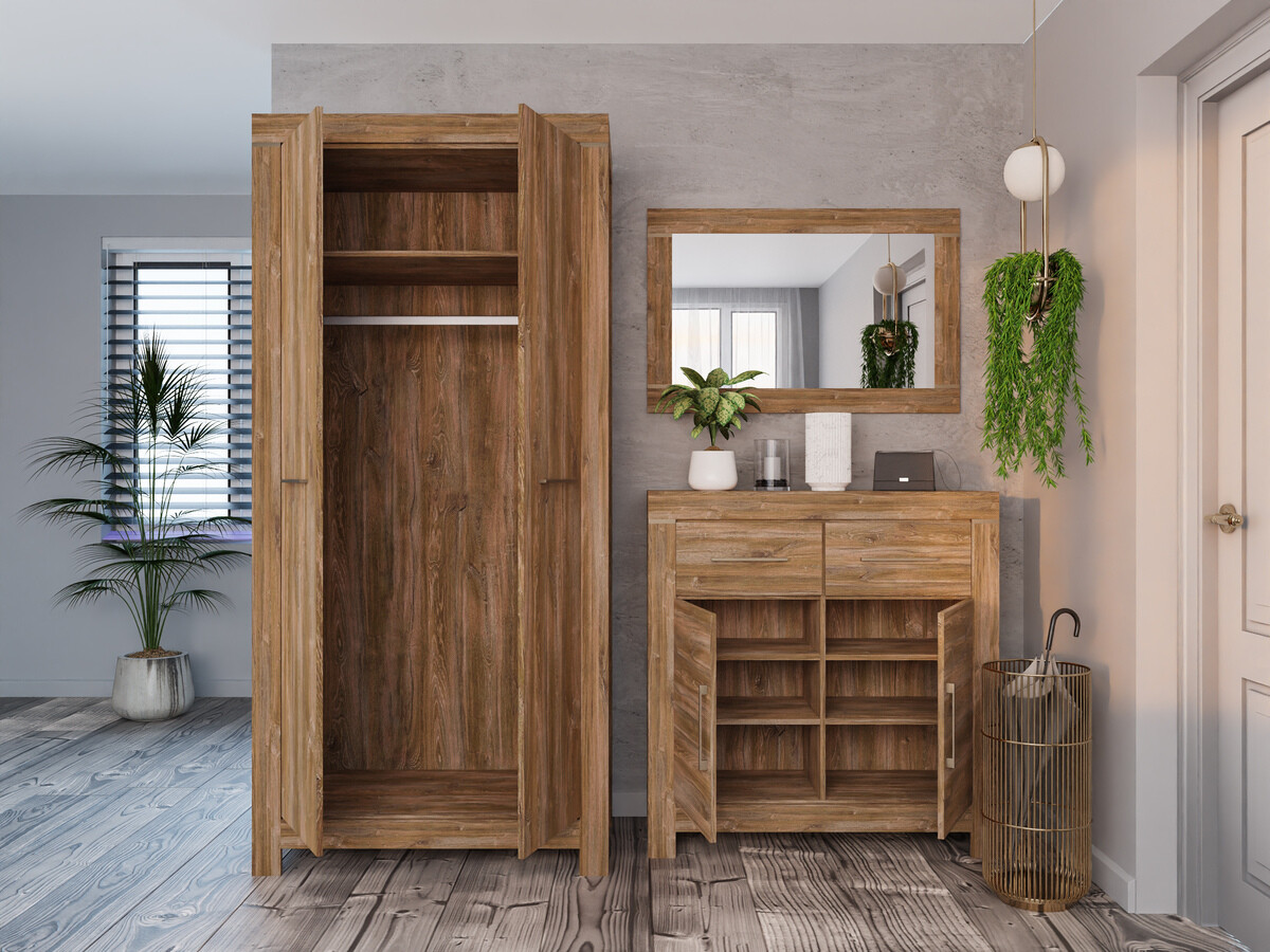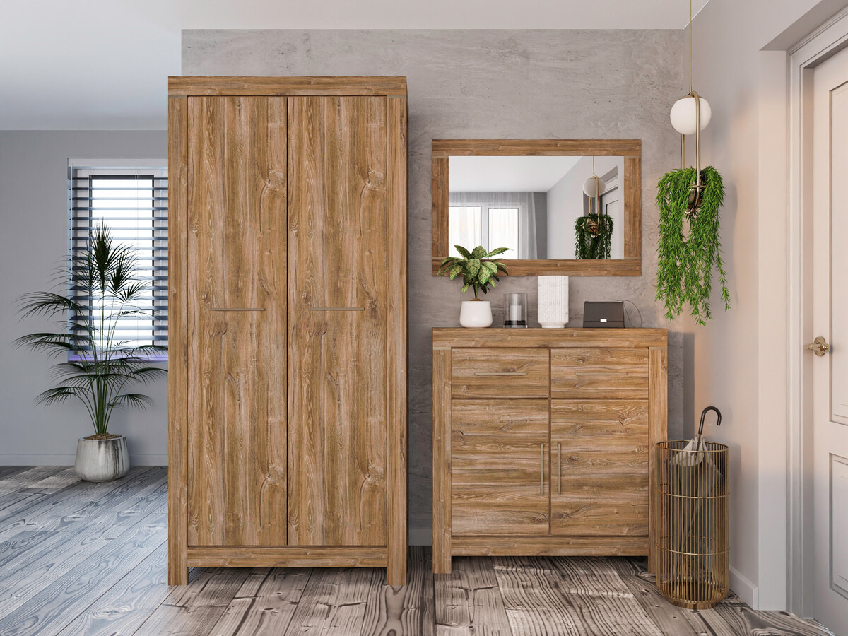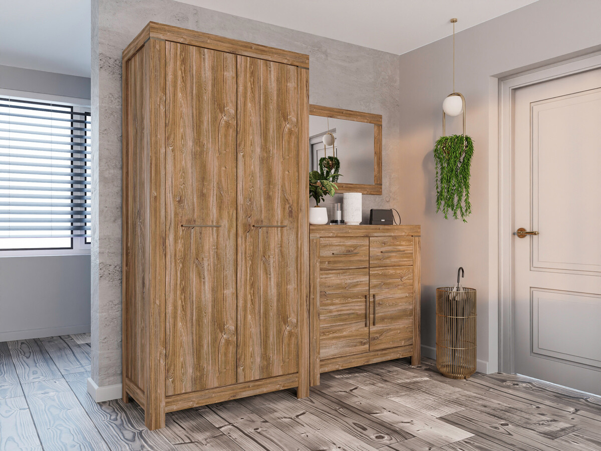 Die Möbelfronten zeigen ein deutlich sichtbares Holzdekor, das zusammen mit der Farbe der Eichenholzoptik „Stirling“ dem Haus Gemütlichkeit und Wärme verleiht, und das Ganze wird ästhetisch durch komfortable Metallgriffe ergänzt. Dank des breiten Sortiments können diese modularen Möbel in einer Vielzahl von Räumen im Haus erfolgreich eingesetzt und miteinander kombiniert werden, so dass Kombinationen entstehen, die den individuellen Bedürfnissen entsprechen. Die Innenräume der Schränke und Schubladen sind geräumig genug, um eine effiziente Aufbewahrung verschiedener Gegenstände zu gewährleisten, während die LED-Beleuchtung in den Vitrinen, Hängeregalen, TV-Tischen und Regalen einen Hauch von Romantik vermittelt. Die Vitrinen dieser Kollektion sind mit gehärtetem Glas ausgestattet, das eine viel höhere Festigkeit als gewöhnliches Glas aufweist. Die Möbelkollektion verfügt über einen geräuschlosen Schließmechanismus, der für mehr Komfort sorgt und es Ihnen ermöglicht, zusätzliche Geräusche bei der Verwendung von Schubladen oder Schränken zu vermeiden.
