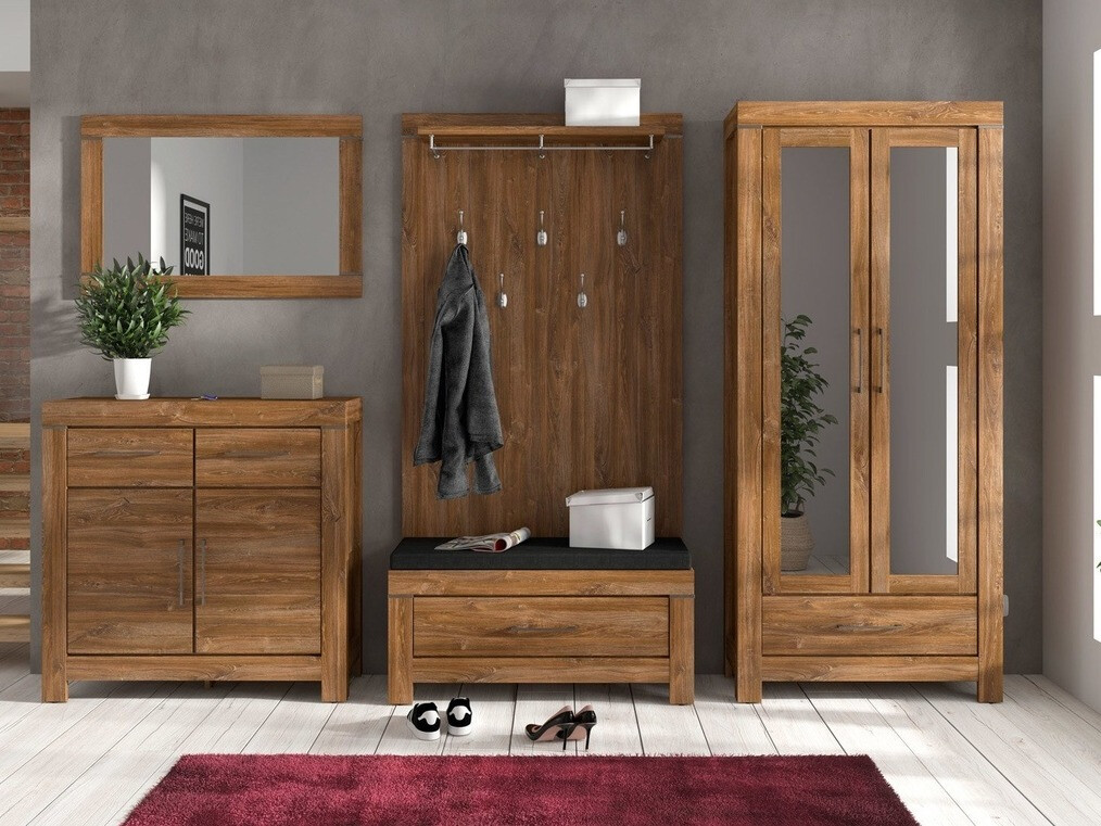 Die Schlichtheit, die exklusiven Formen und die satten Farben der Fronten dieser Möbelkollektion fügen sich perfekt in eine Vielzahl von Innenräumen ein und sprechen sowohl Liebhaber des klassischen als auch des exklusiven Designs an. Die Möbelfronten zeigen ein deutlich sichtbares Holzdekor, das zusammen mit der Farbe der Eichenholzoptik „Stirling“ dem Haus Gemütlichkeit und Wärme verleiht, und das Ganze wird ästhetisch durch komfortable Metallgriffe ergänzt. Dank des breiten Sortiments können diese modularen Möbel in einer Vielzahl von Räumen im Haus erfolgreich eingesetzt und miteinander kombiniert werden, so dass Kombinationen entstehen, die den individuellen Bedürfnissen entsprechen. Die Innenräume der Schränke und Schubladen sind geräumig genug, um eine effiziente Aufbewahrung verschiedener Gegenstände zu gewährleisten, während die LED-Beleuchtung in den Vitrinen, Hängeregalen, TV-Tischen und Regalen einen Hauch von Romantik vermittelt. Die Vitrinen dieser Kollektion sind mit gehärtetem Glas ausgestattet, das eine viel höhere Festigkeit als gewöhnliches Glas aufweist. Die Möbelkollektion verfügt über einen geräuschlosen Schließmechanismus, der für mehr Komfort sorgt und es Ihnen ermöglicht, zusätzliche Geräusche bei der Verwendung von Schubladen oder Schränken zu vermeiden.