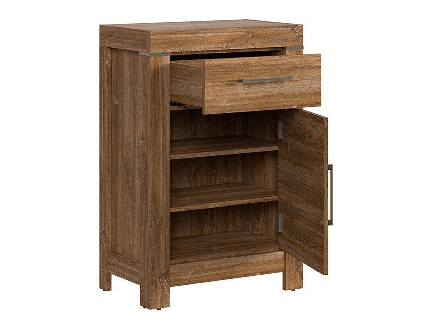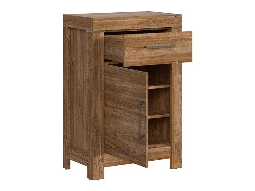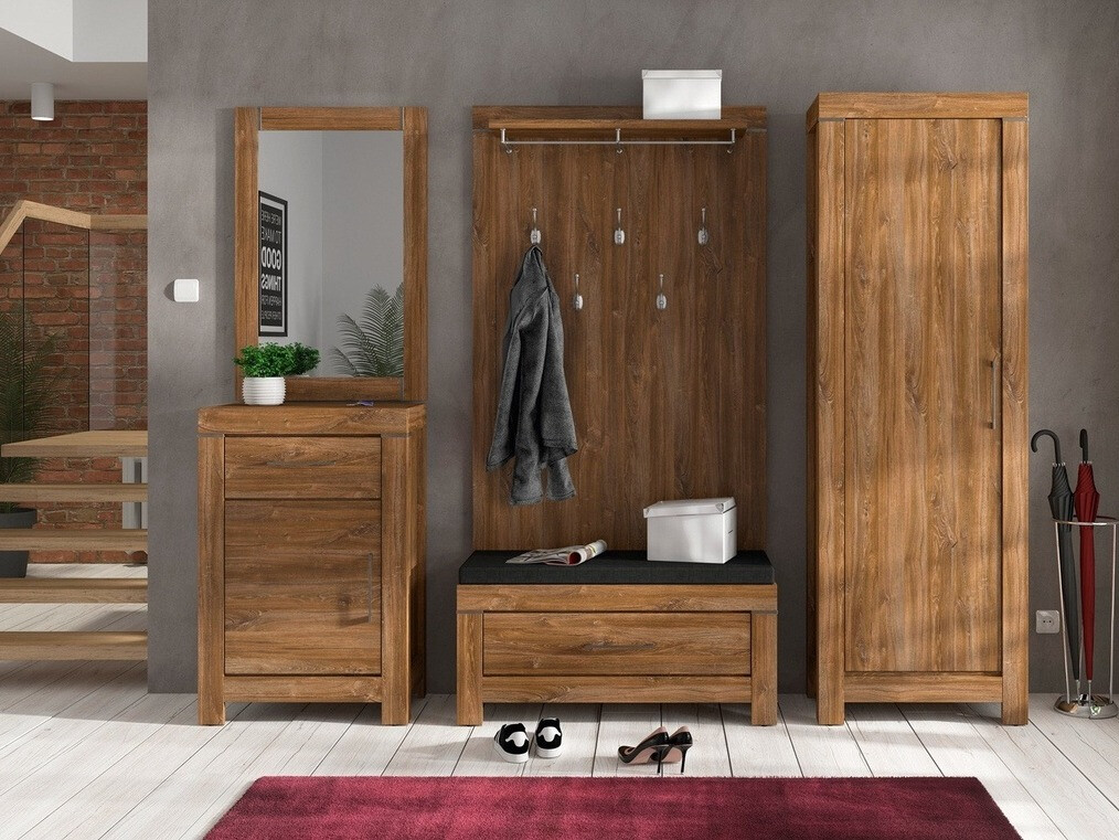 Die Schlichtheit, die exklusiven Formen und die satten Farben der Fronten dieser Möbelkollektion fügen sich perfekt in eine Vielzahl von Innenräumen ein und sprechen sowohl Liebhaber des klassischen als auch des exklusiven Designs an. Die Möbelfronten zeigen ein deutlich sichtbares Holzdekor, das zusammen mit der Farbe der Eichenholzoptik „Stirling“ dem Haus Gemütlichkeit und Wärme verleiht, und das Ganze wird ästhetisch durch komfortable Metallgriffe ergänzt. Dank des breiten Sortiments können diese modularen Möbel in einer Vielzahl von Räumen im Haus erfolgreich eingesetzt und miteinander kombiniert werden, so dass Kombinationen entstehen, die den individuellen Bedürfnissen entsprechen. Die Innenräume der Schränke und Schubladen sind geräumig genug, um eine effiziente Aufbewahrung verschiedener Gegenstände zu gewährleisten, während die LED-Beleuchtung in den Vitrinen, Hängeregalen, TV-Tischen und Regalen einen Hauch von Romantik vermittelt. Die Vitrinen dieser Kollektion sind mit gehärtetem Glas ausgestattet, das eine viel höhere Festigkeit als gewöhnliches Glas aufweist. Die Möbelkollektion verfügt über einen geräuschlosen Schließmechanismus, der für mehr Komfort sorgt und es Ihnen ermöglicht, zusätzliche Geräusche bei der Verwendung von Schubladen oder Schränken zu vermeiden.