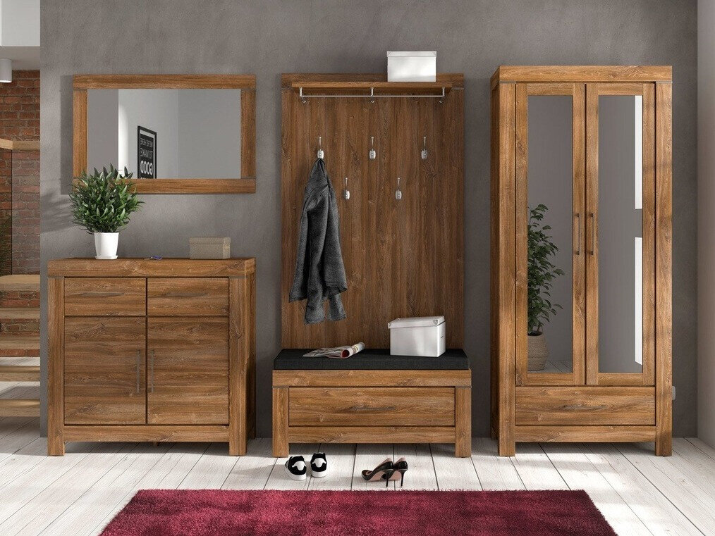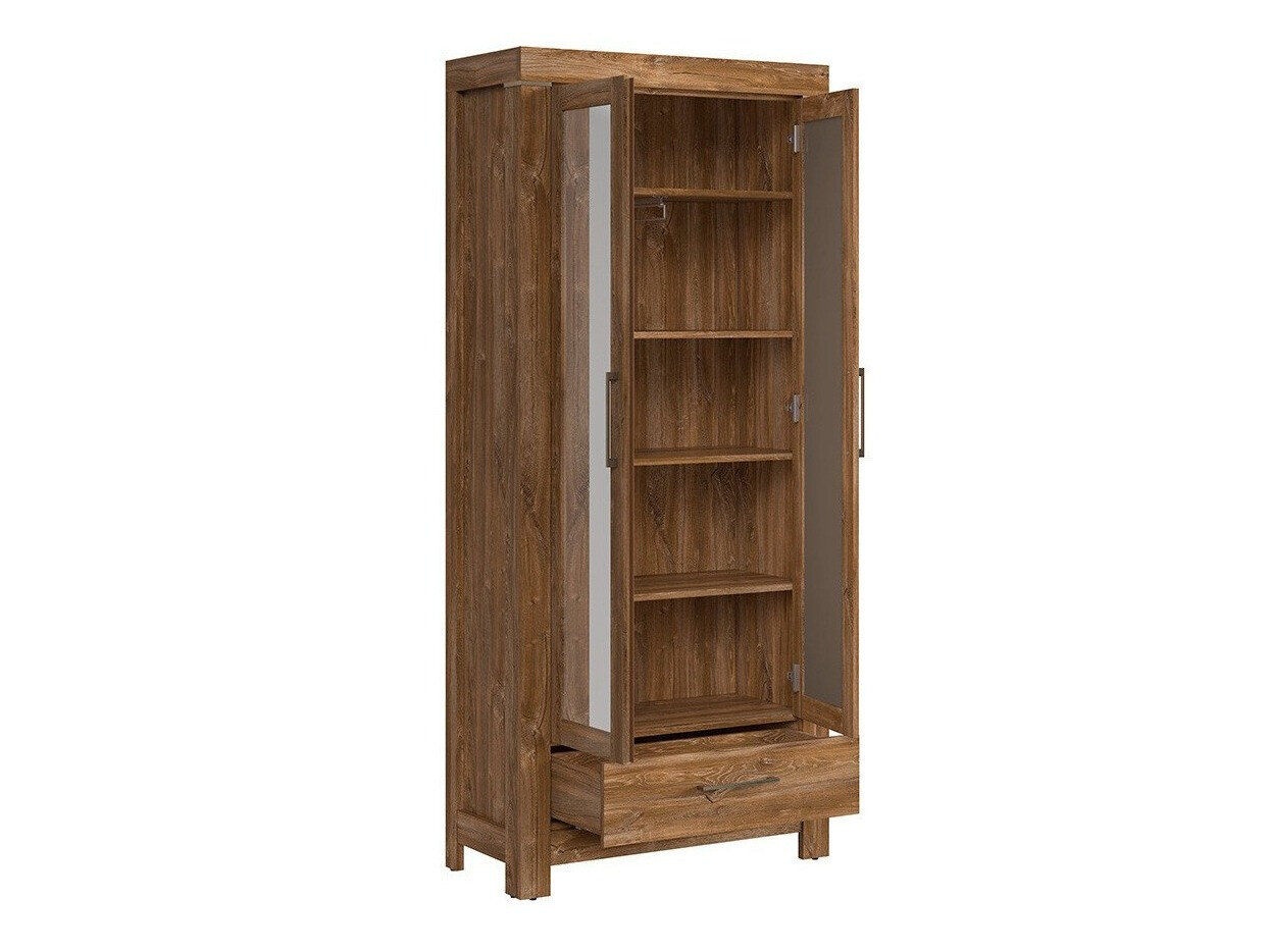Die Schlichtheit, die exklusiven Formen und die satten Farben der Fronten dieser Möbelkollektion fügen sich perfekt in eine Vielzahl von Innenräumen ein und sprechen sowohl Liebhaber des klassischen als auch des exklusiven Designs an. Die Möbelfronten zeigen ein deutlich sichtbares Holzdekor, das zusammen mit der Farbe der Eichenholzoptik „Stirling“ dem Haus Gemütlichkeit und Wärme verleiht, und das Ganze wird ästhetisch durch komfortable Metallgriffe ergänzt. Dank des breiten Sortiments können diese modularen Möbel in einer Vielzahl von Räumen im Haus erfolgreich eingesetzt und miteinander kombiniert werden, so dass Kombinationen entstehen, die den individuellen Bedürfnissen entsprechen. Die Innenräume der Schränke und Schubladen sind geräumig genug, um eine effiziente Aufbewahrung verschiedener Gegenstände zu gewährleisten, während die LED-Beleuchtung in den Vitrinen, Hängeregalen, TV-Tischen und Regalen einen Hauch von Romantik vermittelt. Die Vitrinen dieser Kollektion sind mit gehärtetem Glas ausgestattet, das eine viel höhere Festigkeit als gewöhnliches Glas aufweist. Die Möbelkollektion verfügt über einen geräuschlosen Schließmechanismus, der für mehr Komfort sorgt und es Ihnen ermöglicht, zusätzliche Geräusche bei der Verwendung von Schubladen oder Schränken zu vermeiden.
