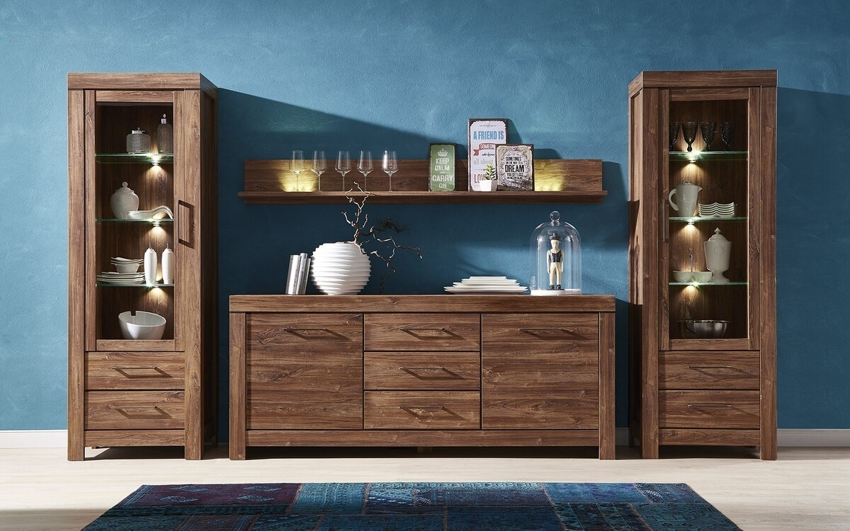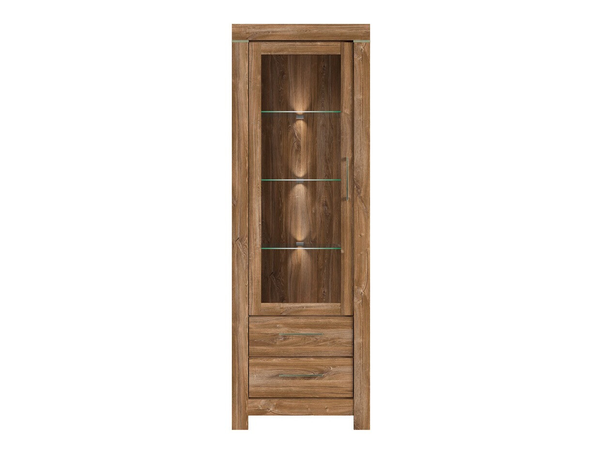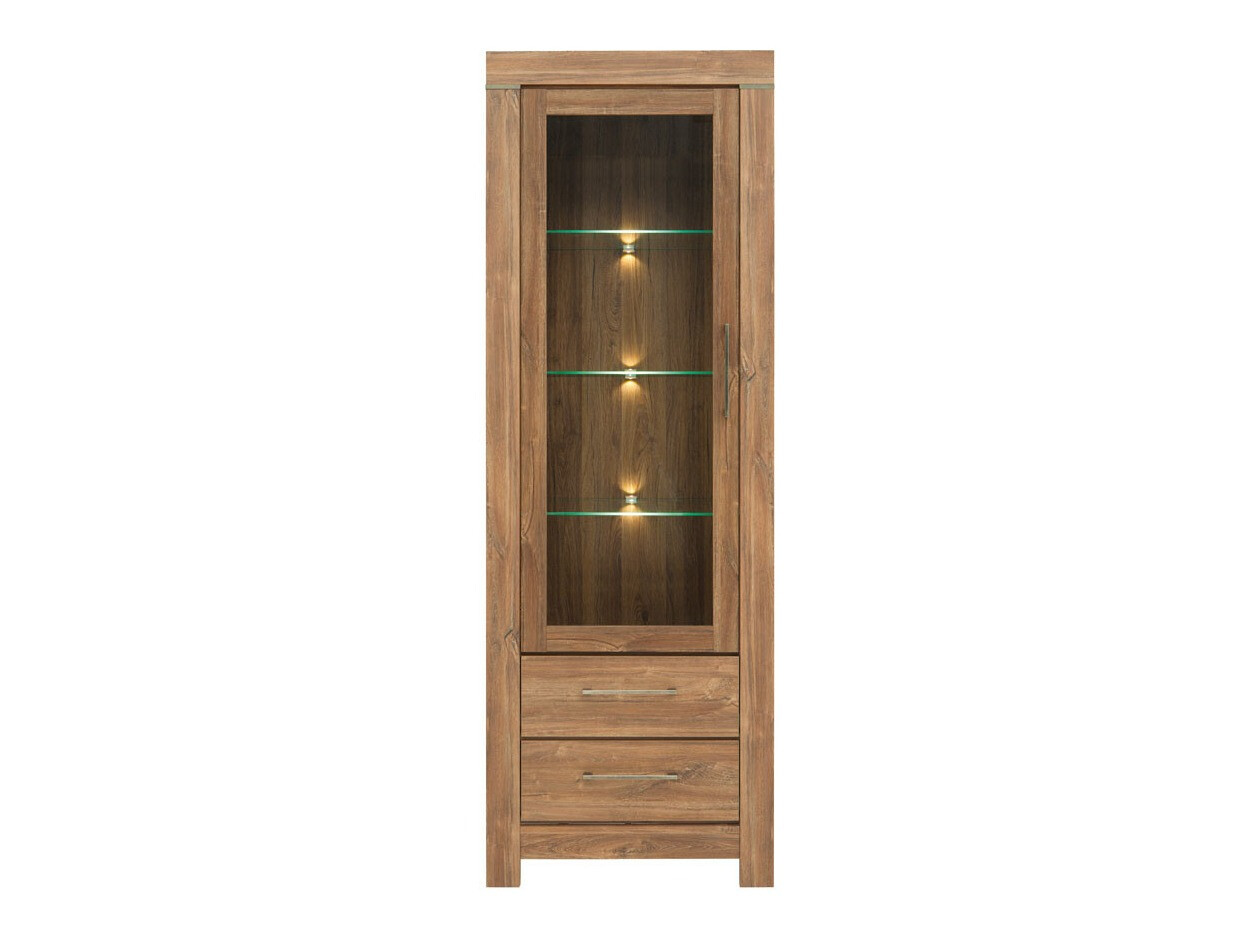 Die Schlichtheit, die exklusiven Formen und die satten Farben der Fronten dieser Möbelkollektion fügen sich perfekt in eine Vielzahl von Innenräumen ein und sprechen sowohl Liebhaber des klassischen als auch des exklusiven Designs an. Die Möbelfronten zeigen ein deutlich sichtbares Holzdekor, das zusammen mit der Farbe der Eichenholzoptik „Stirling“ dem Haus Gemütlichkeit und Wärme verleiht, und das Ganze wird ästhetisch durch komfortable Metallgriffe ergänzt. Dank des breiten Sortiments können diese modularen Möbel in einer Vielzahl von Räumen im Haus erfolgreich eingesetzt und miteinander kombiniert werden, so dass Kombinationen entstehen, die den individuellen Bedürfnissen entsprechen. Die Innenräume der Schränke und Schubladen sind geräumig genug, um eine effiziente Aufbewahrung verschiedener Gegenstände zu gewährleisten, während die LED-Beleuchtung in den Vitrinen, Hängeregalen, TV-Tischen und Regalen einen Hauch von Romantik vermittelt. Die Vitrinen dieser Kollektion sind mit gehärtetem Glas ausgestattet, das eine viel höhere Festigkeit als gewöhnliches Glas aufweist. Die Möbelkollektion verfügt über einen geräuschlosen Schließmechanismus, der für mehr Komfort sorgt und es Ihnen ermöglicht, zusätzliche Geräusche bei der Verwendung von Schubladen oder Schränken zu vermeiden.
