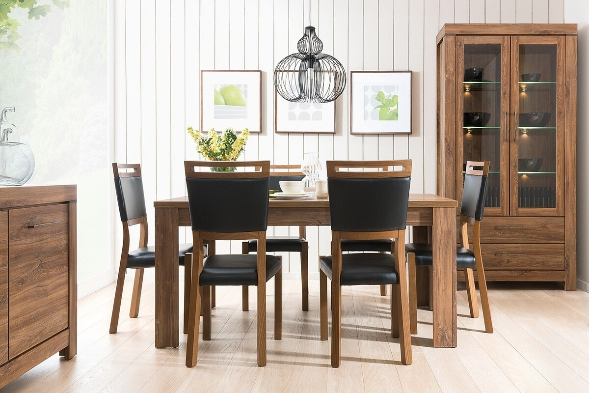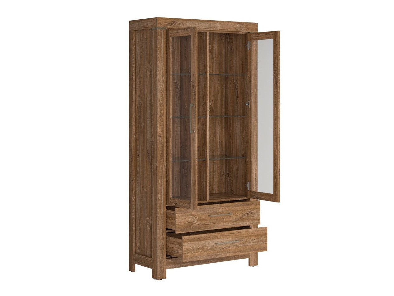 Die Schlichtheit, die exklusiven Formen und die satten Farben der Fronten dieser Möbelkollektion fügen sich perfekt in eine Vielzahl von Innenräumen ein und sprechen sowohl Liebhaber des klassischen als auch des exklusiven Designs an. Die Möbelfronten zeigen ein deutlich sichtbares Holzdekor, das zusammen mit der Farbe der Eichenholzoptik „Stirling“ dem Haus Gemütlichkeit und Wärme verleiht, und das Ganze wird ästhetisch durch komfortable Metallgriffe ergänzt. Dank des breiten Sortiments können diese modularen Möbel in einer Vielzahl von Räumen im Haus erfolgreich eingesetzt und miteinander kombiniert werden, so dass Kombinationen entstehen, die den individuellen Bedürfnissen entsprechen. Die Innenräume der Schränke und Schubladen sind geräumig genug, um eine effiziente Aufbewahrung verschiedener Gegenstände zu gewährleisten, während die LED-Beleuchtung in den Vitrinen, Hängeregalen, TV-Tischen und Regalen einen Hauch von Romantik vermittelt. Die Vitrinen dieser Kollektion sind mit gehärtetem Glas ausgestattet, das eine viel höhere Festigkeit als gewöhnliches Glas aufweist. Die Möbelkollektion verfügt über einen geräuschlosen Schließmechanismus, der für mehr Komfort sorgt und es Ihnen ermöglicht, zusätzliche Geräusche bei der Verwendung von Schubladen oder Schränken zu vermeiden.
