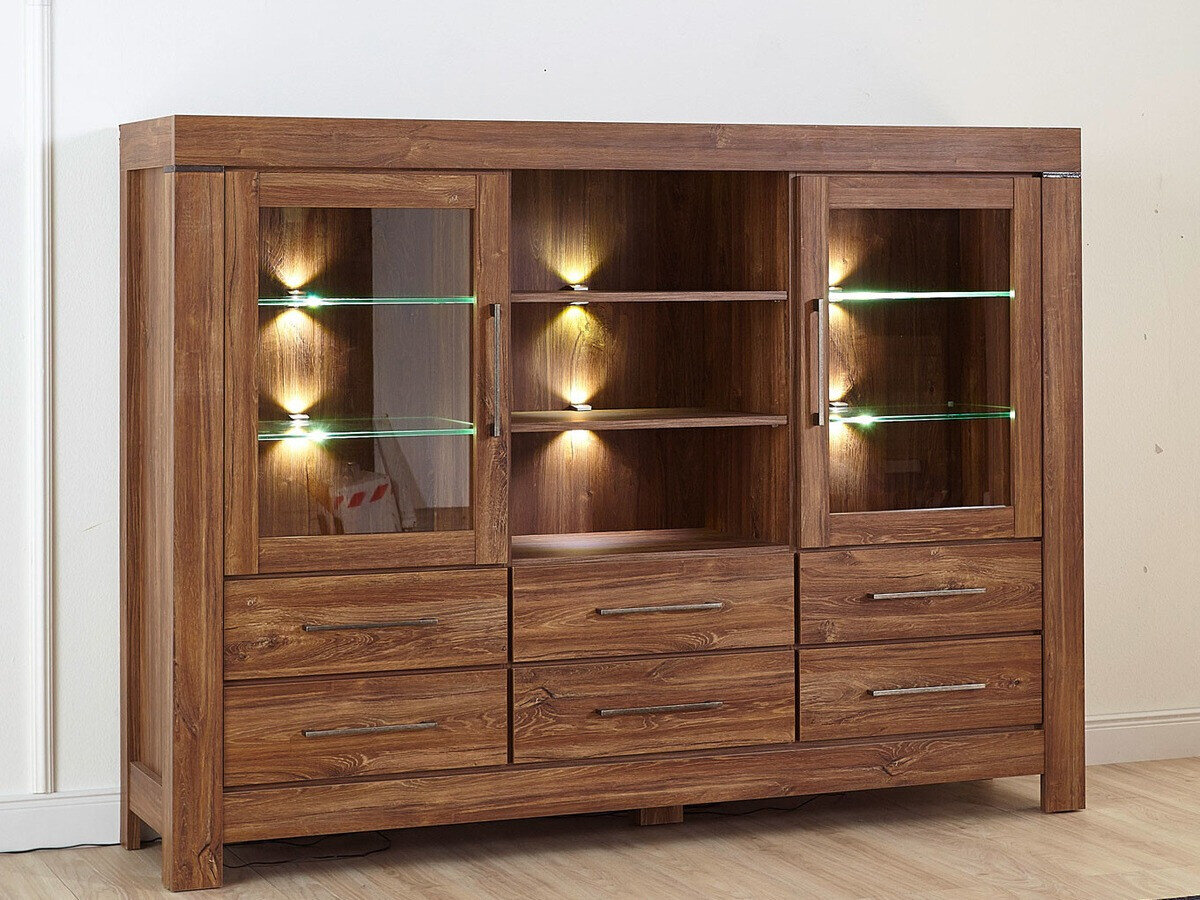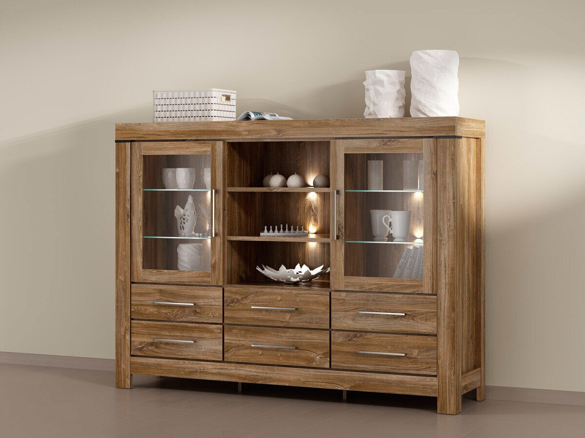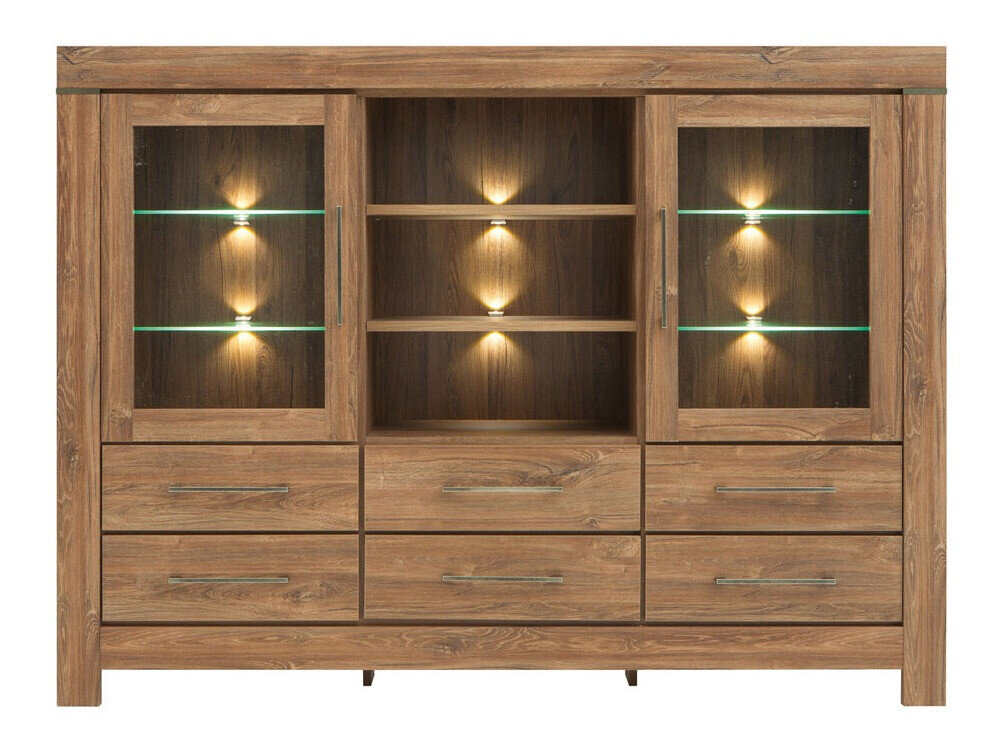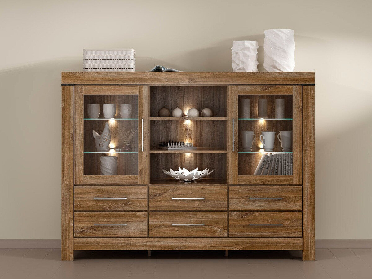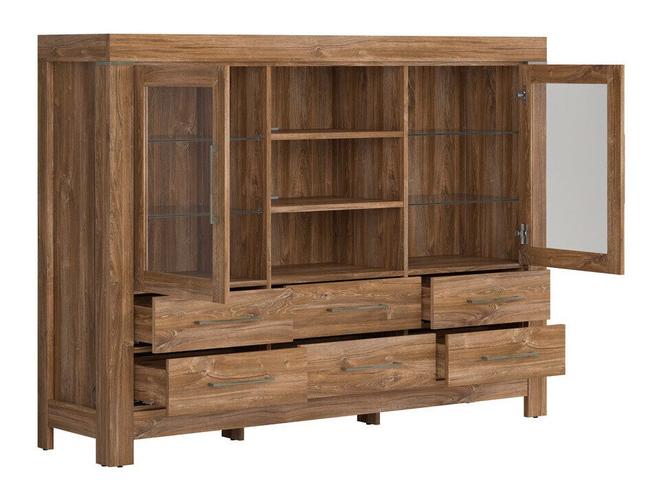 Die Schlichtheit, die exklusiven Formen und die satten Farben der Fronten dieser Möbelkollektion fügen sich perfekt in eine Vielzahl von Innenräumen ein und sprechen sowohl Liebhaber des klassischen als auch des exklusiven Designs an. Die Möbelfronten zeigen ein deutlich sichtbares Holzdekor, das zusammen mit der Farbe der Eichenholzoptik „Stirling“ dem Haus Gemütlichkeit und Wärme verleiht, und das Ganze wird ästhetisch durch komfortable Metallgriffe ergänzt. Dank des breiten Sortiments können diese modularen Möbel in einer Vielzahl von Räumen im Haus erfolgreich eingesetzt und miteinander kombiniert werden, so dass Kombinationen entstehen, die den individuellen Bedürfnissen entsprechen. Die Innenräume der Schränke und Schubladen sind geräumig genug, um eine effiziente Aufbewahrung verschiedener Gegenstände zu gewährleisten, während die LED-Beleuchtung in den Vitrinen, Hängeregalen, TV-Tischen und Regalen einen Hauch von Romantik vermittelt. Die Vitrinen dieser Kollektion sind mit gehärtetem Glas ausgestattet, das eine viel höhere Festigkeit als gewöhnliches Glas aufweist. Die Möbelkollektion verfügt über einen geräuschlosen Schließmechanismus, der für mehr Komfort sorgt und es Ihnen ermöglicht, zusätzliche Geräusche bei der Verwendung von Schubladen oder Schränken zu vermeiden.