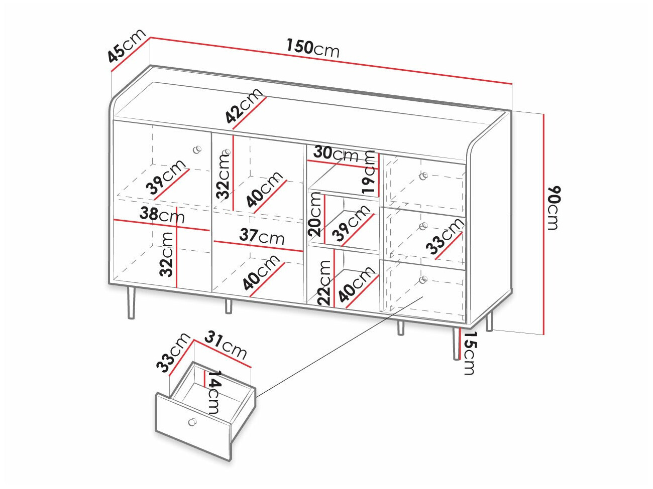 Subtilität, Eleganz und ein Hauch von Retro - so lässt sich diese Kollektion kurz beschreiben. Die elegante Form und die luxuriöse Kombination aus dunkler Eichenholzoptik und Schwarz verleihen den Möbeln ihre Einzigartigkeit. Die Kollektion umfasst alle Möbel, die für ein organisiertes Wohnzimmer benötigt werden. Die Möbel sind aus laminierten Spanplatten gefertigt, deren Kanten mit einem speziellen ABS-Band geschützt sind. Dank der hochwertigen ABS-Kanten sind die Möbel stoßfester. Die Türen und Schubladen haben einen geräuschlosen Schließmechanismus, dank dem sich die Schubladen und Türen leicht und ohne Geräusch schließen. Die Fronten der Möbel sind mit kleinen schwarzen Metallgriffen verziert, die zu den Möbeln dieser eleganten Kollektion passen. Die zierlichen Metallbeine verleihen den unregelmäßig geformten Möbeln Originalität und Stil. Die Möbel dieser Kollektion verfügen sowohl über offene als auch geschlossene Ablageflächen, so dass alle Gegenstände übersichtlich untergebracht werden können. Der verglaste Teil der Vitrinen ist aus gehärtetem Glas gefertigt. Seine Widerstandsfähigkeit ist 5- bis 6-mal höher als die von gewöhnlichem, thermisch unbehandeltem Glas. Diese Art von Möbeln eignet sich ideal für die Präsentation von Dekorationen, Geschirr oder Fotos. Darüber hinaus kann man dieses Möbelstück mit einer LED-Beleuchtung ausstatten, die zusätzlich bestellt werden kann. Außerdem sind die Vitrinen universell, so dass die Öffnungsrichtung der Glastüren bei der Montage festgelegt werden kann. Gestalten Sie ein einzigartiges Wohnzimmer aus einzelnen Möbelstücken der Kollektion oder wählen Sie aus vorgefertigten Möbelsets. Mit den Möbeln dieser Kollektion wird der gewünschte Raum zu einer Oase des Komforts und der Eleganz.