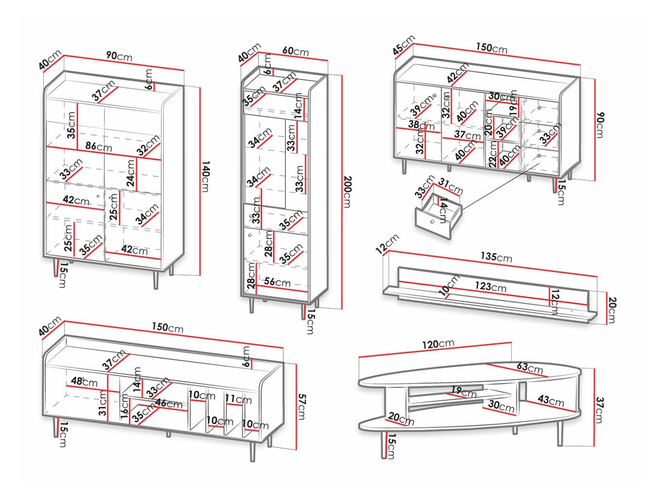 Subtilität, Eleganz und ein Hauch von Retro - so lässt sich diese Kollektion kurz beschreiben. Die elegante Form und die luxuriöse Kombination aus dunkler Eichenholzoptik und Schwarz verleihen den Möbeln ihre Einzigartigkeit. Die Kollektion umfasst alle Möbel, die für ein organisiertes Wohnzimmer benötigt werden. Die Möbel sind aus laminierten Spanplatten gefertigt, deren Kanten mit einem speziellen ABS-Band geschützt sind. Dank der hochwertigen ABS-Kanten sind die Möbel stoßfester. Die Türen und Schubladen haben einen geräuschlosen Schließmechanismus, dank dem sich die Schubladen und Türen leicht und ohne Geräusch schließen. Die Fronten der Möbel sind mit kleinen schwarzen Metallgriffen verziert, die zu den Möbeln dieser eleganten Kollektion passen. Die zierlichen Metallbeine verleihen den unregelmäßig geformten Möbeln Originalität und Stil. Die Möbel dieser Kollektion verfügen sowohl über offene als auch geschlossene Ablageflächen, so dass alle Gegenstände übersichtlich untergebracht werden können. Der verglaste Teil der Vitrinen ist aus gehärtetem Glas gefertigt. Seine Widerstandsfähigkeit ist 5- bis 6-mal höher als die von gewöhnlichem, thermisch unbehandeltem Glas. Diese Art von Möbeln eignet sich ideal für die Präsentation von Dekorationen, Geschirr oder Fotos. Darüber hinaus kann man dieses Möbelstück mit einer LED-Beleuchtung ausstatten, die zusätzlich bestellt werden kann. Außerdem sind die Vitrinen universell, so dass die Öffnungsrichtung der Glastüren bei der Montage festgelegt werden kann. Gestalten Sie ein einzigartiges Wohnzimmer aus einzelnen Möbelstücken der Kollektion oder wählen Sie aus vorgefertigten Möbelsets. Mit den Möbeln dieser Kollektion wird der gewünschte Raum zu einer Oase des Komforts und der Eleganz.