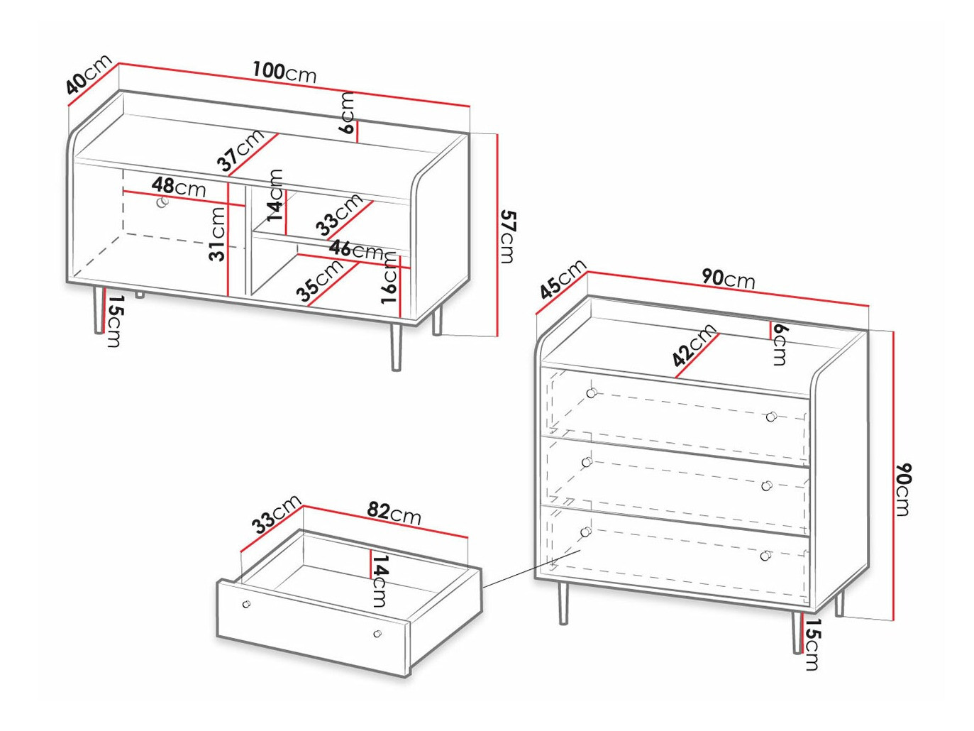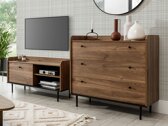 Subtilität, Eleganz und ein Hauch von Retro - so lässt sich diese Kollektion kurz beschreiben. Die elegante Form und die luxuriöse Kombination aus dunkler Eichenholzoptik und Schwarz verleihen den Möbeln ihre Einzigartigkeit. Die Kollektion umfasst alle Möbel, die für ein organisiertes Wohnzimmer benötigt werden. Die Möbel sind aus laminierten Spanplatten gefertigt, deren Kanten mit einem speziellen ABS-Band geschützt sind. Dank der hochwertigen ABS-Kanten sind die Möbel stoßfester. Die Türen und Schubladen haben einen geräuschlosen Schließmechanismus, dank dem sich die Schubladen und Türen leicht und ohne Geräusch schließen. Die Fronten der Möbel sind mit kleinen schwarzen Metallgriffen verziert, die zu den Möbeln dieser eleganten Kollektion passen. Die zierlichen Metallbeine verleihen den unregelmäßig geformten Möbeln Originalität und Stil. Die Möbel dieser Kollektion verfügen sowohl über offene als auch geschlossene Ablageflächen, so dass alle Gegenstände übersichtlich untergebracht werden können. Der verglaste Teil der Vitrinen ist aus gehärtetem Glas gefertigt. Seine Widerstandsfähigkeit ist 5- bis 6-mal höher als die von gewöhnlichem, thermisch unbehandeltem Glas. Diese Art von Möbeln eignet sich ideal für die Präsentation von Dekorationen, Geschirr oder Fotos. Darüber hinaus kann man dieses Möbelstück mit einer LED-Beleuchtung ausstatten, die zusätzlich bestellt werden kann. Außerdem sind die Vitrinen universell, so dass die Öffnungsrichtung der Glastüren bei der Montage festgelegt werden kann. Gestalten Sie ein einzigartiges Wohnzimmer aus einzelnen Möbelstücken der Kollektion oder wählen Sie aus vorgefertigten Möbelsets. Mit den Möbeln dieser Kollektion wird der gewünschte Raum zu einer Oase des Komforts und der Eleganz.