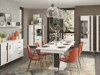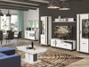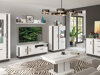 Bei dieser Wohnzimmermöbelkollektion dominiert glänzendes Weiß, ergänzt durch schwarze Details. Holzimitat-Elemente verleihen den Möbeln einen exklusiven Charakter. Die Fronten der Möbel sind mit schwarzen Kunststoffgriffen verziert. Das in der Kollektion verwendete gehärtete Glas ist widerstandsfähiger gegen mechanische Einwirkungen als gewöhnliches Glas. Eine optionale energiesparende LED-Beleuchtung sorgt für eine einzigartige Atmosphäre. Die Kanten der Möbel sind mit einem speziellen Abdeckband geschützt, das sie vor kleineren Beschädigungen schützt. Die Möbel verfügen über einen geräuschlosen Schließmechanismus, der ein schnelles Schließen von Schubladen und Türen verhindert.
