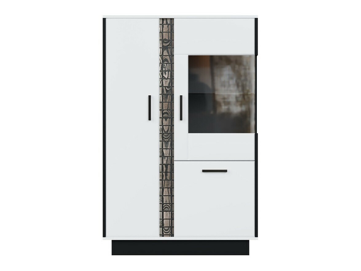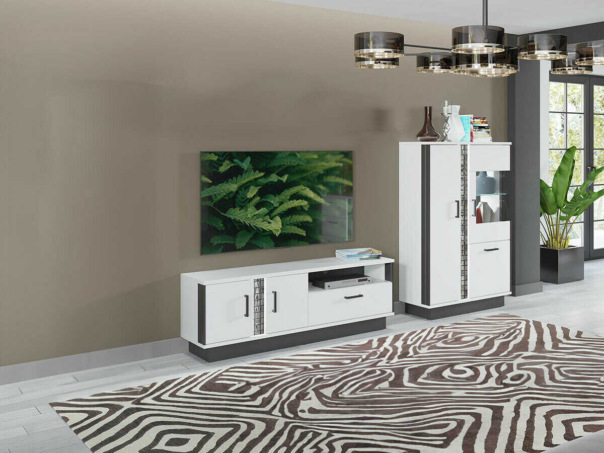 Bei dieser Wohnzimmermöbelkollektion dominiert glänzendes Weiß, ergänzt durch schwarze Details. Holzimitat-Elemente verleihen den Möbeln einen exklusiven Charakter. Die Fronten der Möbel sind mit schwarzen Kunststoffgriffen verziert. Das in der Kollektion verwendete gehärtete Glas ist widerstandsfähiger gegen mechanische Einwirkungen als gewöhnliches Glas. Eine optionale energiesparende LED-Beleuchtung sorgt für eine einzigartige Atmosphäre. Die Kanten der Möbel sind mit einem speziellen Abdeckband geschützt, das sie vor kleineren Beschädigungen schützt. Die Möbel verfügen über einen geräuschlosen Schließmechanismus, der ein schnelles Schließen von Schubladen und Türen verhindert. Wenn Sie ein exklusives und stilvolles Wohninterieur schaffen möchten, laden wir Sie ein, auf diese Kollektion zu achten!