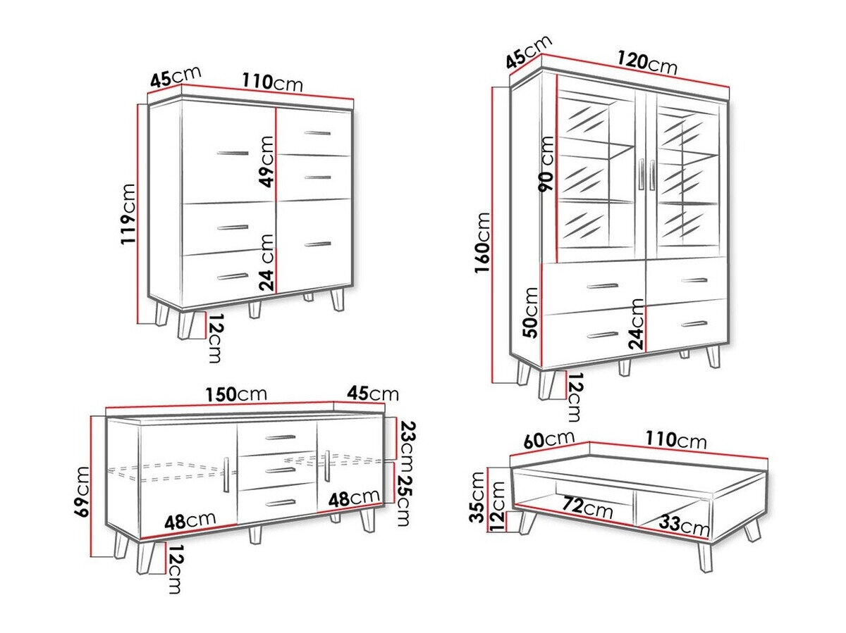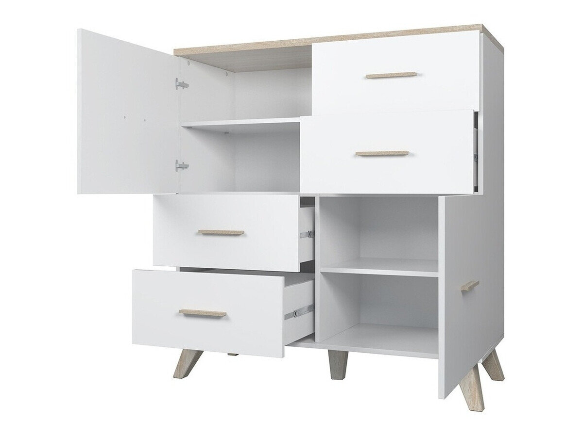 Schon von weitem erkennt man die skandinavischen Merkmale der Möbelkollektion - Schlichtheit, Minimalismus und Natürlichkeit. Die Möbel dieser Kollektion wurden mit Blick auf den Alltagskomfort entworfen, daher basiert das Design auf dem Wesentlichen: großzügige Regale und Schubladen sowie geräumige geschlossene Schränke. Alle Möbel stehen auf 12 cm hohen Beinen, die ihnen den Eindruck von Leichtigkeit verleihen, während die länglichen Griffe das minimalistische Design betonen. Die Möbel stecken voll nordischer Ästhetik und passen perfekt zu modernen Elementen wie den voll verglasten Vitrinenregalen, die Geschirr oder Familiensouvenirs aufnehmen können. Die Farben der Fronten verleihen dem Wohnzimmer Harmonie und Gemütlichkeit. Die Möbelkollektion ist in mehreren Farbvarianten erhältlich: Eichenholzoptik „Wotan“ mit Weiß oder Weiß mit hellen Eichenholzakzenten. Die Kollektion umfasst alle wesentlichen Möbel für das Wohnzimmer: Couch- und Fernsehtische, eine Kommode, einen Schrank, eine Vitrine und einen Kleiderschrank.