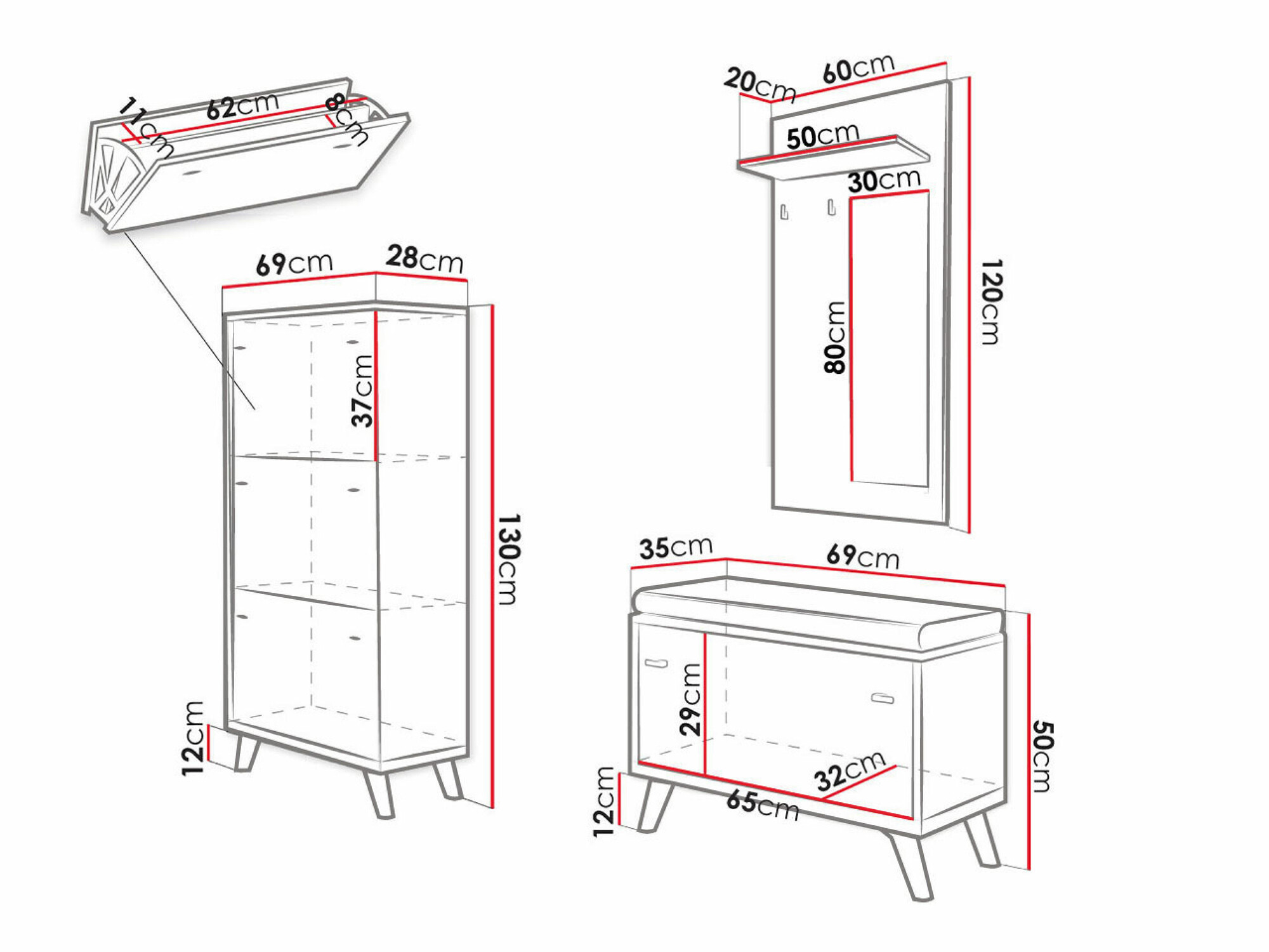 Ein gutes Flurset, geeignet für besonders schmale Flure, da es sehr kompakt ist. Geräumiges Schuhregal, Stiefel können nicht zu eng darin platziert werden. Das Set eignet sich für einen einfachen Zugang darunter sowohl mit einem Roboter als auch mit einem Besen beim Waschen des Bodens .