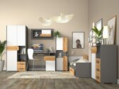 In einem Jugendzimmer ist es besonders wichtig, Funktionalität und Design zu vereinen. Wenn Sie auf der Suche nach modernen Lösungen für das Jugendzimmer sind, dann lohnt sich ein Blick auf diese Kollektion. Die Möbel aus dieser Kollektion sind auf die Bedürfnisse einer jugendlichen Persönlichkeit zugeschnitten, so dass hier Modernität mit Funktionalität einhergeht. Für die Möbelfronten wurde ein asymmetrisches Design gewählt, das für Verspieltheit sorgt. Es werden drei Farben verwendet: Weiß, Graphit und Eichenholzoptik. Die Eichenholzoptik sorgt für Gemütlichkeit und hebt sich gleichzeitig als Akzent ab. Die einzigartige Form der Griffe passt perfekt zum Möbeldesign und zieht die Blicke auf sich. In der Kollektion finden Sie die notwendigsten Möbel für das Zimmer eines jungen Menschen. Geräumige Möbelabschnitte sorgen dafür, dass alle Dinge ihren Platz finden und es ein Vergnügen ist, Ordnung zu halten.