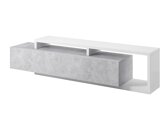 Die Möbel passen zum grauen Boden, es handelt sich um ein hochwertiges, modernes Möbelstück mit Stauraum, der Fernseher kann darauf gestellt oder an die Wand gehängt werden