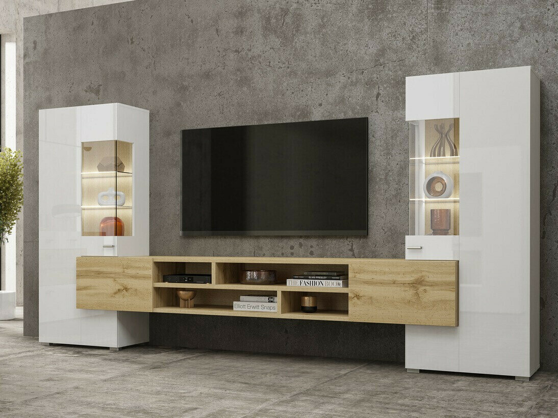 Achten Sie auf diese Kollektion im modernen Stil. Diese Möbel sind sowohl praktisch als auch optisch ansprechend gestaltet. Die sorgfältig abgestimmten Kunststoffgriffe der Kollektion fügen sich nahtlos in das Gesamtdesign ein und setzen einen subtilen, aber modernen Akzent. Die Farbpalette der Kollektion umfasst verschiedene Eichentöne, kombiniert mit einer glänzenden oder extrem matten Oberfläche, wodurch ein unerwartetes Farbduett entsteht. Diese Kollektion verkörpert eine klare und aufgeräumte Ästhetik, perfekt für diejenigen, die Einfachheit und Eleganz schätzen.