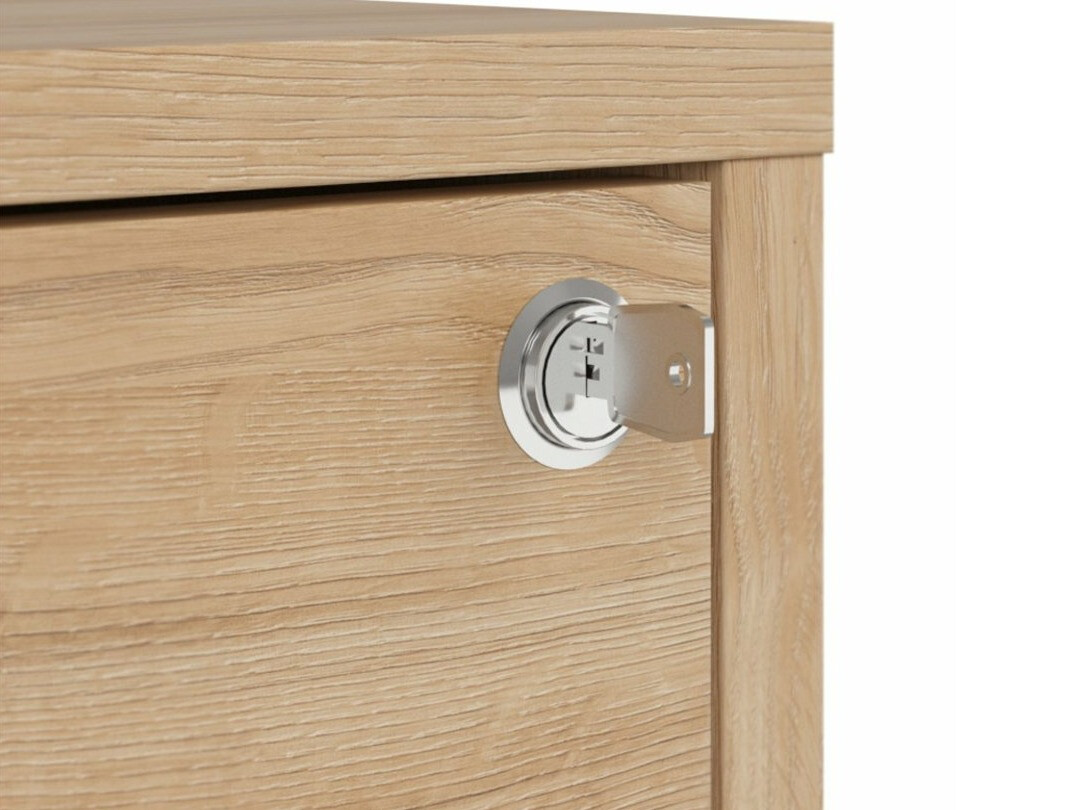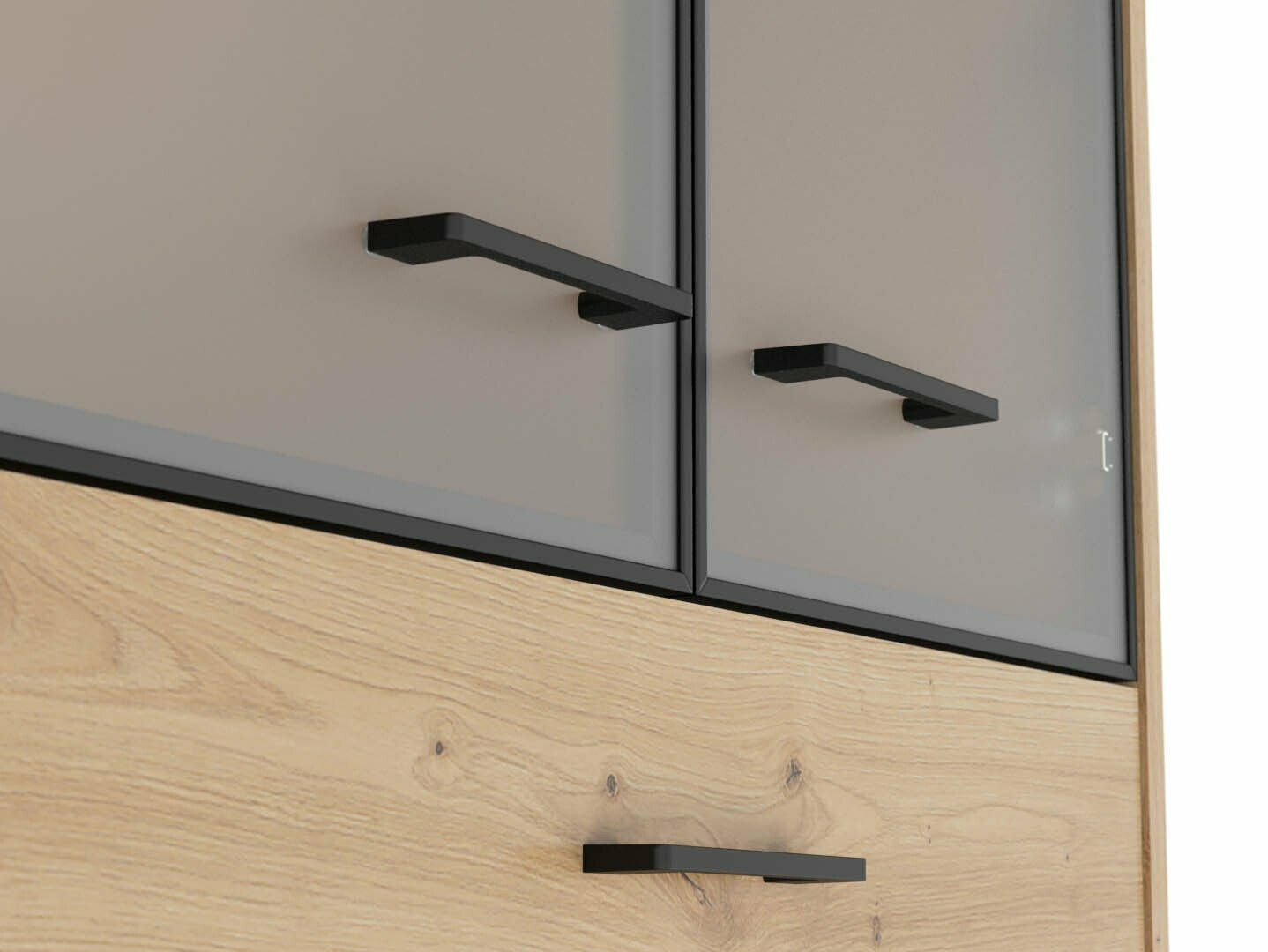 Wenn Sie auf der Suche nach funktionellen Möbeln sind, ist diese Kollektion genau das Richtige für Sie! Die Kombination aus Eichenholzoptik „Artisan“ und Schwarz verleiht den Möbeln Modernität. Die minimalistischen schwarzen Kunststoffgriffe fügen sich perfekt in das Design ein. Die Möbel der Kollektion bestehen aus laminierten Spanplatten mit einer kratzfesten Oberfläche. Mit dieser Schutzfolie werden die Möbel nicht nur kratzfest, sondern auch besser vor Feuchtigkeit oder Flecken geschützt. Der in den Möbeln eingebaute geräuschlosen Schließmechanismus verbessert das Benutzererlebnis und sorgt für ein geräuschloses Öffnen und Schließen der Türen und Schubladen. Die Möbel haben sowohl offene als auch geschlossene Ablageflächen. So können persönliche Gegenstände auf sichtbaren Regalen oder versteckt hinter Türen aufbewahrt werden. Für die Kollektion wird wärmebehandeltes, gehärtetes Milchglas verwendet. Seine Widerstandsfähigkeit ist 5- bis 6-mal höher als die von gewöhnlichem, thermisch unbehandeltem Glas. Das Glas wird von einem schwarzen Aluminiumrahmen eingefasst. Die Regale der Kollektion sind universell einsetzbar. Bei der Montage kann man entscheiden, in welche Richtung sich die Tür öffnen soll. Die Schubladenschränke haben Rollen anstelle von Füßen, was das Verschieben der Möbel im Raum sehr einfach und bequem macht. Die Einlegeböden ermöglichen außerdem eine noch sicherere Aufbewahrung von persönlichen Gegenständen. Das Gestell der Schreibtische dieser Kollektion besteht aus einem schwarzen Metallrahmen, der für Stabilität sorgt. Für diejenigen, die einen funktionalen Schreibtisch suchen, bietet die Kollektion Schreibtische mit einer elektrischen Höhenverstellung. Mit Hilfe einiger Knöpfe lässt sich die Höhe des Tisches verändern, so dass Sie Ihre Arbeit noch bequemer und ergonomischer erledigen können. Mit den funktionalen und universellen Möbeln wird die Einrichtung eines Büros zum Vergnügen.
