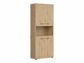 Wenn Sie auf der Suche nach funktionellen Möbeln sind, ist diese Kollektion genau das Richtige für Sie! Die Kombination aus Eichenholzoptik „Artisan“ und Schwarz verleiht den Möbeln Modernität. Die minimalistischen schwarzen Kunststoffgriffe fügen sich perfekt in das Design ein. Die Möbel der Kollektion bestehen aus laminierten Spanplatten mit einer kratzfesten Oberfläche. Mit dieser Schutzfolie werden die Möbel nicht nur kratzfest, sondern auch besser vor Feuchtigkeit oder Flecken geschützt. Der in den Möbeln eingebaute geräuschlosen Schließmechanismus verbessert das Benutzererlebnis und sorgt für ein geräuschloses Öffnen und Schließen der Türen und Schubladen. Die Möbel haben sowohl offene als auch geschlossene Ablageflächen. So können persönliche Gegenstände auf sichtbaren Regalen oder versteckt hinter Türen aufbewahrt werden. Für die Kollektion wird wärmebehandeltes, gehärtetes Milchglas verwendet. Seine Widerstandsfähigkeit ist 5- bis 6-mal höher als die von gewöhnlichem, thermisch unbehandeltem Glas. Das Glas wird von einem schwarzen Aluminiumrahmen eingefasst. Die Regale der Kollektion sind universell einsetzbar. Bei der Montage kann man entscheiden, in welche Richtung sich die Tür öffnen soll. Die Schubladenschränke haben Rollen anstelle von Füßen, was das Verschieben der Möbel im Raum sehr einfach und bequem macht. Die Einlegeböden ermöglichen außerdem eine noch sicherere Aufbewahrung von persönlichen Gegenständen. Das Gestell der Schreibtische dieser Kollektion besteht aus einem schwarzen Metallrahmen, der für Stabilität sorgt. Für diejenigen, die einen funktionalen Schreibtisch suchen, bietet die Kollektion Schreibtische mit einer elektrischen Höhenverstellung. Mit Hilfe einiger Knöpfe lässt sich die Höhe des Tisches verändern, so dass Sie Ihre Arbeit noch bequemer und ergonomischer erledigen können. Mit den funktionalen und universellen Möbeln wird die Einrichtung eines Büros zum Vergnügen.