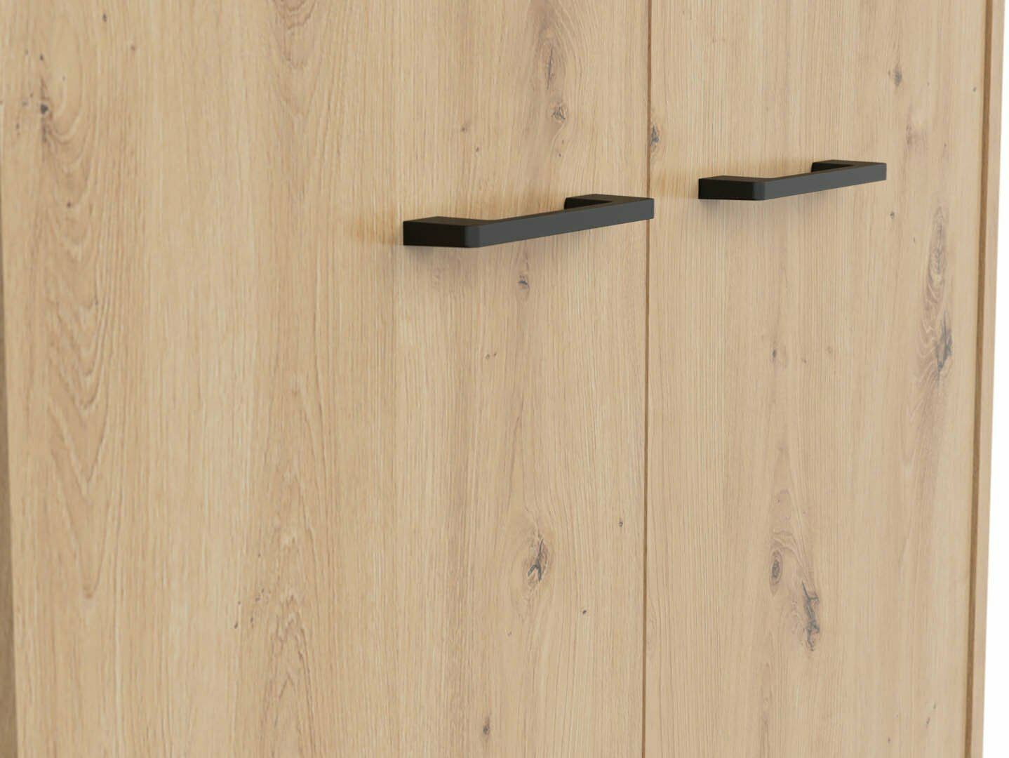 Die Kombination aus Eichenholzoptik „Artisan“ und Schwarz verleiht den Möbeln Modernität. Die minimalistischen schwarzen Kunststoffgriffe fügen sich perfekt in das Design ein. Die Möbel der Kollektion bestehen aus laminierten Spanplatten mit einer kratzfesten Oberfläche. Mit dieser Schutzfolie werden die Möbel nicht nur kratzfest, sondern auch besser vor Feuchtigkeit oder Flecken geschützt. Der in den Möbeln eingebaute geräuschlosen Schließmechanismus verbessert das Benutzererlebnis und sorgt für ein geräuschloses Öffnen und Schließen der Türen und Schubladen.