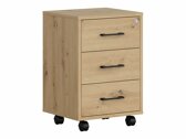 Wenn Sie auf der Suche nach funktionellen Möbeln sind, ist diese Kollektion genau das Richtige für Sie! Die Kombination aus Eichenholzoptik „Artisan“ und Schwarz verleiht den Möbeln Modernität. Die minimalistischen schwarzen Kunststoffgriffe fügen sich perfekt in das Design ein. Die Möbel der Kollektion bestehen aus laminierten Spanplatten mit einer kratzfesten Oberfläche. Mit dieser Schutzfolie werden die Möbel nicht nur kratzfest, sondern auch besser vor Feuchtigkeit oder Flecken geschützt. Der in den Möbeln eingebaute geräuschlosen Schließmechanismus verbessert das Benutzererlebnis und sorgt für ein geräuschloses Öffnen und Schließen der Türen und Schubladen. Die Möbel haben sowohl offene als auch geschlossene Ablageflächen. So können persönliche Gegenstände auf sichtbaren Regalen oder versteckt hinter Türen aufbewahrt werden. Für die Kollektion wird wärmebehandeltes, gehärtetes Milchglas verwendet. Seine Widerstandsfähigkeit ist 5- bis 6-mal höher als die von gewöhnlichem, thermisch unbehandeltem Glas. Das Glas wird von einem schwarzen Aluminiumrahmen eingefasst. Die Regale der Kollektion sind universell einsetzbar. Bei der Montage kann man entscheiden, in welche Richtung sich die Tür öffnen soll. Die Schubladenschränke haben Rollen anstelle von Füßen, was das Verschieben der Möbel im Raum sehr einfach und bequem macht. Die Einlegeböden ermöglichen außerdem eine noch sicherere Aufbewahrung von persönlichen Gegenständen. Das Gestell der Schreibtische dieser Kollektion besteht aus einem schwarzen Metallrahmen, der für Stabilität sorgt. Für diejenigen, die einen funktionalen Schreibtisch suchen, bietet die Kollektion Schreibtische mit einer elektrischen Höhenverstellung. Mit Hilfe einiger Knöpfe lässt sich die Höhe des Tisches verändern, so dass Sie Ihre Arbeit noch bequemer und ergonomischer erledigen können. Mit den funktionalen und universellen Möbeln wird die Einrichtung eines Büros zum Vergnügen.