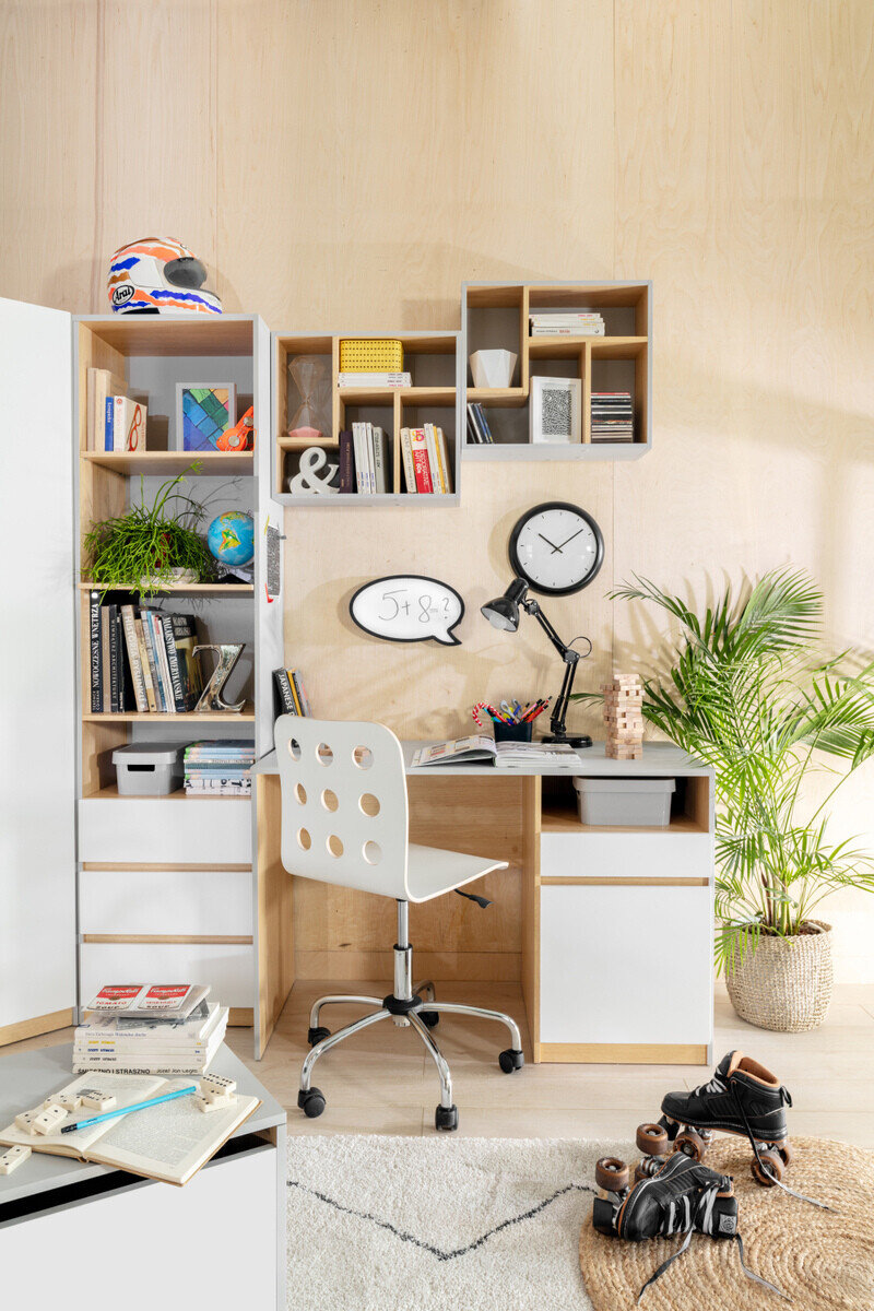 In einem Kinder- oder Jugendzimmer ist es wichtig, ein Gleichgewicht zwischen Design und Funktionalität zu schaffen. In diesem Raum kann man seiner Fantasie freien Lauf lassen, ohne Angst vor grellen Farben oder anderen Designelementen zu haben. Innovation und Kreativität gehen bei dieser Kollektion Hand in Hand. Die Möbelkollektion bietet klare Formen in Hellgrau, Eiche und glänzendem Weiß. Die Möbel kombinieren neutrale Farben und bunte Elemente, die das Design als Akzent ergänzen und sich perfekt in das Gesamtbild einfügen. Für Personen, die bunte Elemente eher nicht mögen, finden sich in der Kollektion auch Möbel in neutralen Farben. Die Flexibilität wird durch geräumige Möbel mit offenen und geschlossenen Bereichen gewährleistet. Die Oberflächen der Möbel sind mit einem farblosen Material überzogen, das vor kleinen Kratzern schützt. In den Türen und Schubladen ist ein geräuschloser Schließmechanismus integriert, der für zusätzlichen Komfort bei der Verwendung der Möbel sorgt. Mit der Möbelkollektion lässt sich ganz einfach ein modernes und funktionales Jugendzimmer einrichten.