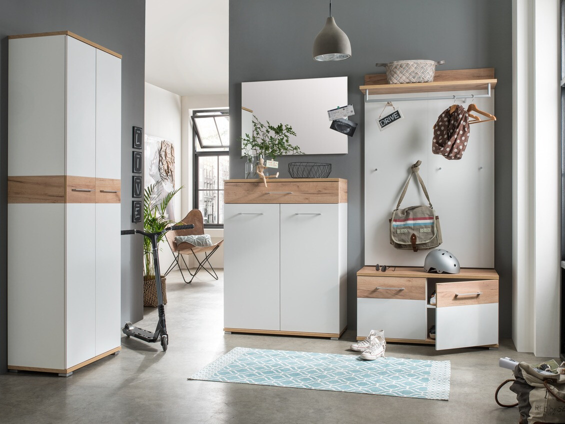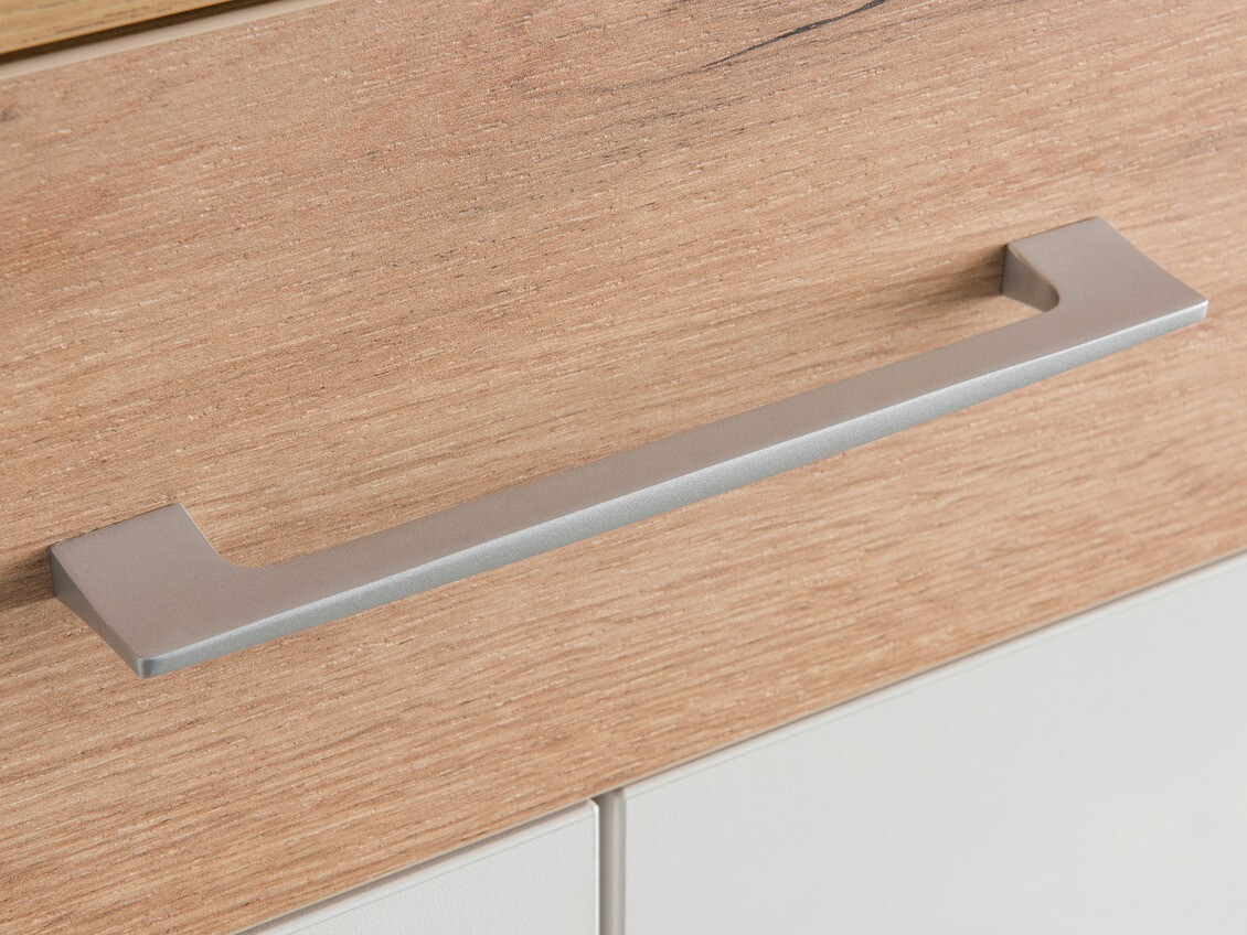 Die Möbelkollektion, die Ihnen hilft, ein modernes Interieur zu Hause zu schaffen. Ergänzt werden die Möbel dieser Kollektion durch metalle, minimalistische Designgriffe, die sich perfekt in das Möbeldesign einfügen. Bei den Möbeln der Kollektion können Sie aus mehreren Farben wählen. Mattweiß kann mit mehreren Farben kombiniert werden: Eiche „Navarra“ und Betongrau. Die Möbel sind pflegeleicht, da sie mit einem farblosen Material überzogen sind, das sie vor kleinen Kratzern schützt und es Ihnen ermöglicht, angesammelten Schmutz leicht zu reinigen. Die mit kunststoffgeschützten Möbelkanten sind widerstandsfähig gegen Beschädigungen durch den täglichen Gebrauch. Die Schubladen und Türen verfügen über einen geräuschlosen Schließmechanismus, das Besondere daran ist, dass er ein schnelles Schließen verhindert. Funktionalität und Komfort sind wesentliche Merkmale dieser in Deutschland hergestellten Kollektion. Gestalten Sie mit dieser Möbelkollektion eine harmonische Wohnumgebung.