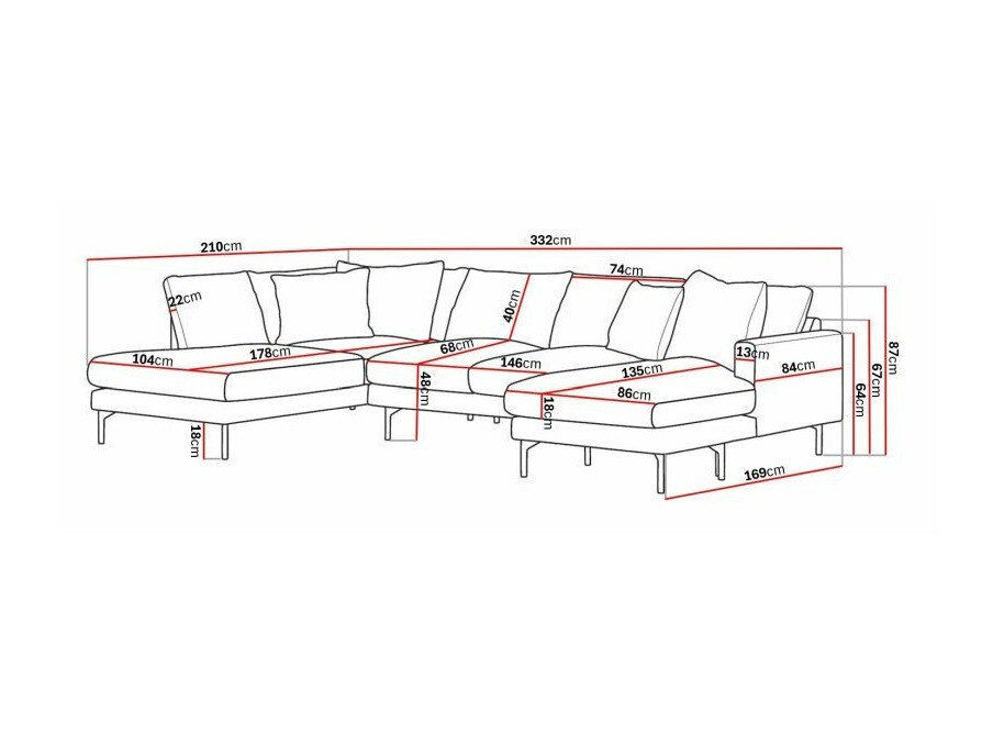 Wenn Sie das Sofa von vorne betrachten, befindet sich der verlängerte Teil bzw. die Ecke der rechtsseitigen Option auf Ihrer rechten Seite. Die gewählte Eckoption sollte den Fluss des Raums verbessern und eine einfache Bewegung innerhalb des Raums ermöglichen.