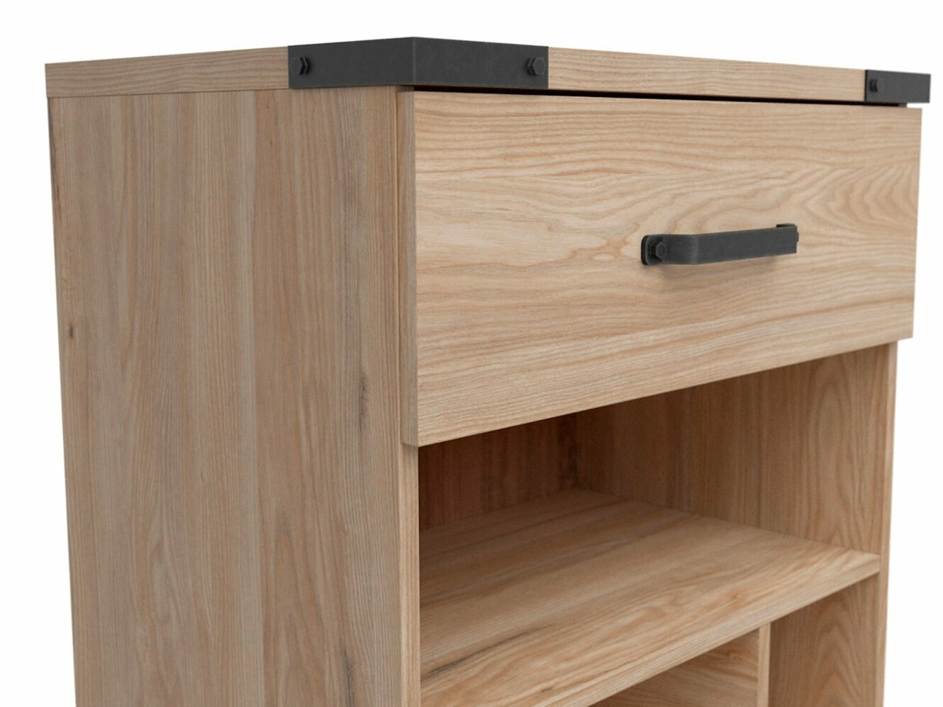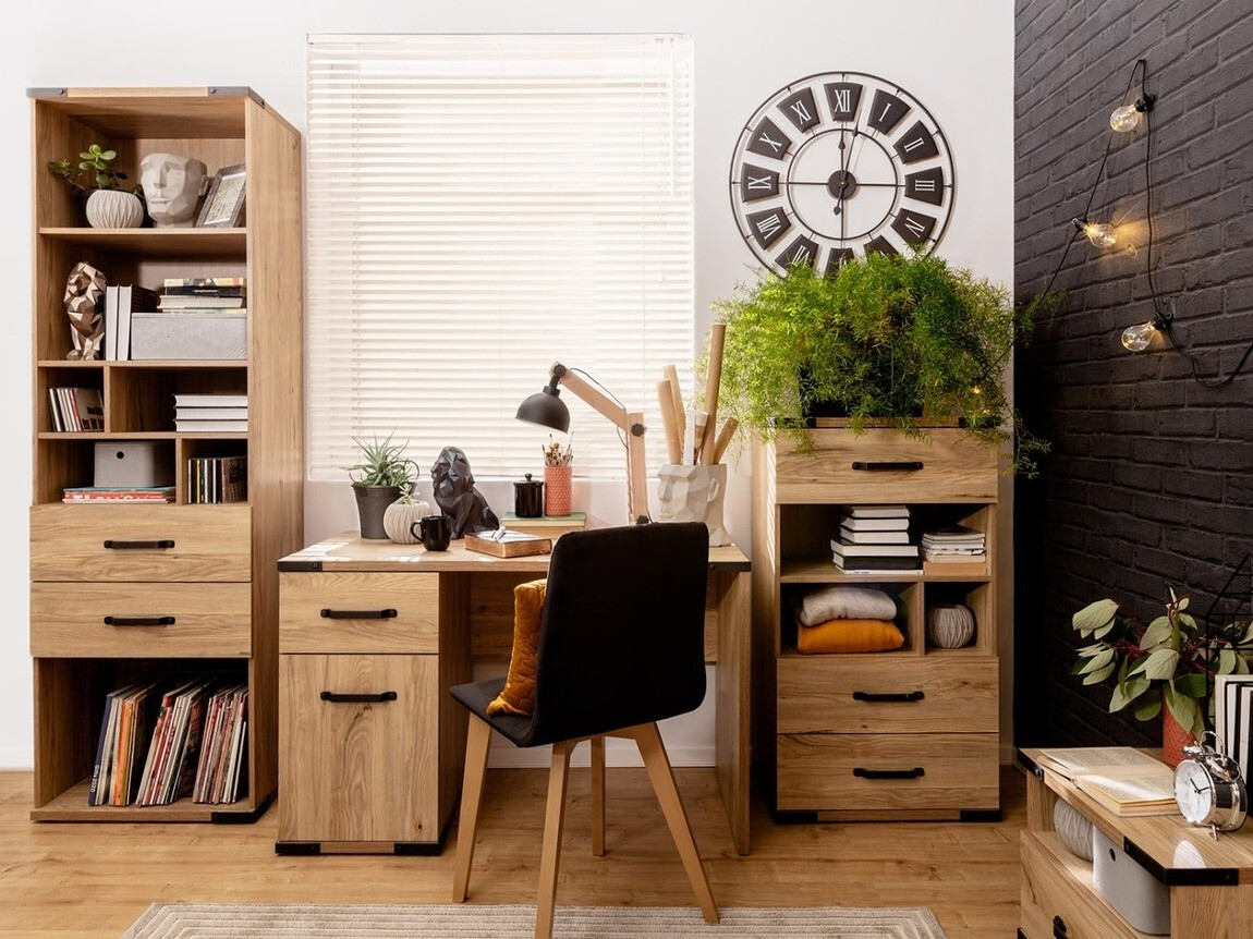 Bei der Einrichtung eines Jugendzimmers ist es wichtig, Funktionalität mit Design zu verbinden. Für jeden jungen Menschen ist sein Zimmer sehr wichtig, daher lohnt es sich, dafür zu sorgen, dass dieser Raum sowohl zum Lernen als auch für die Freizeit geeignet ist. Die von der Natur inspirierte Kollektion zieht mit ihren natürlichen Farben und Details Blicke an. Diese Kollektion trifft auf industrielles und modernes Design. Die Holzoptik wird mit Natur und Natürlichkeit assoziiert, sie verleiht dem Raum Gemütlichkeit. Schlichte Möbelfronten werden durch moderne Designakzente ergänzt – schwarze Metallgriffe. Diese Kombination aus Holzdekor und Metalldetails sieht einzigartig aus. Schwarze Metallakzente finden sich auch in den Ecken der Möbel, die in Form und Farbe zu den Metallgriffen passen. Diese einfachen, aber effektiven Designlösungen unterstreichen die Einzigartigkeit der Möbelserie. Die Kollektion kommt sowohl in hellen als auch in dunklen Innenräumen perfekt zur Geltung. Die Schranktüren und Schubladen verfügen über einen integrierten geräuschlosen Schließmechanismus, der für mehr Komfort bei der Verwendung der Möbel sorgt, da er keinen zusätzlichen Lärm verursacht. Die Möbelkollektion wird dazu beitragen, einen stilvollen Raum für junge Leute zu schaffen.