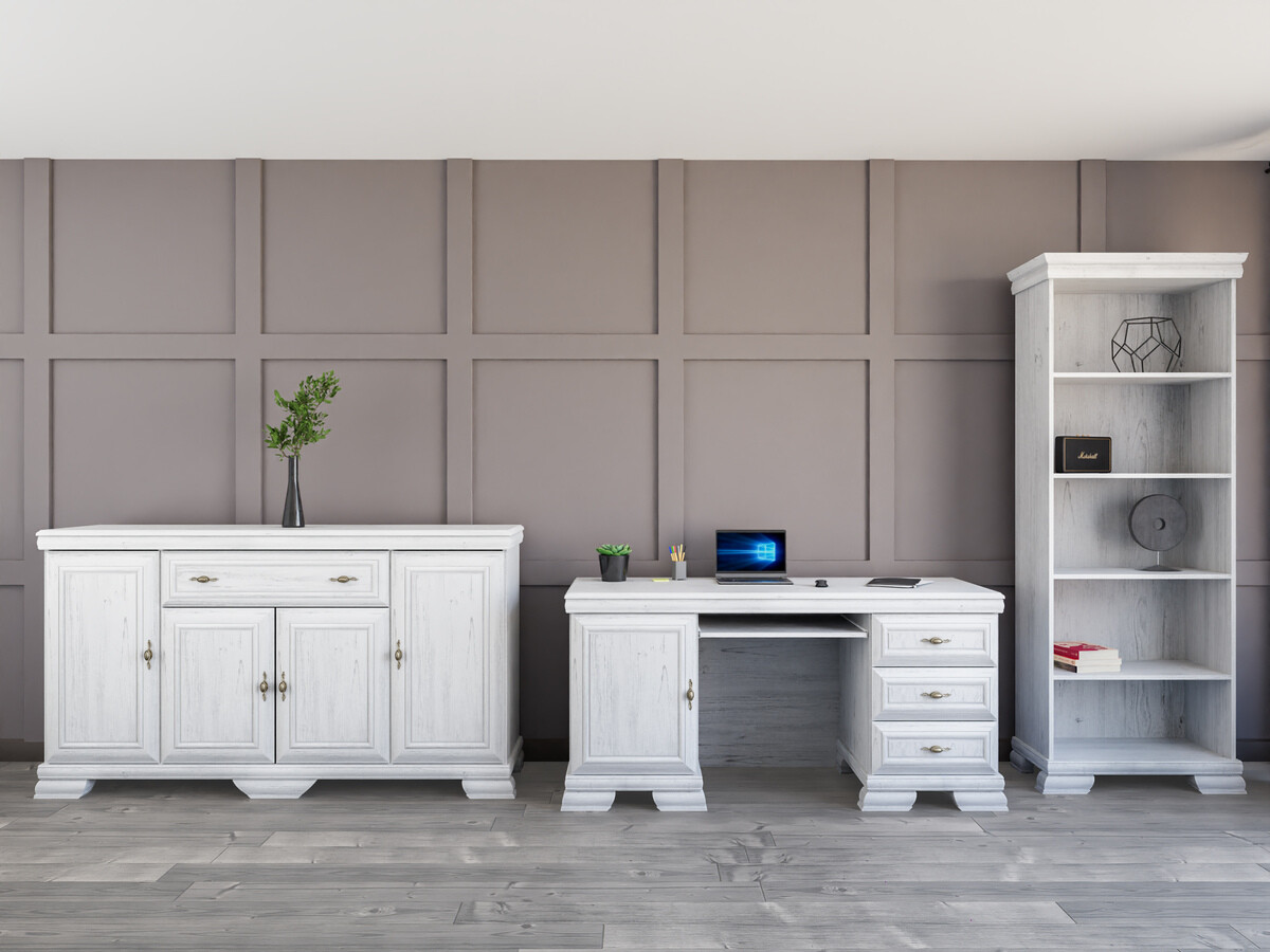 Diese Kollektion im klassischen Stil ist für diejenigen, die zeitloses Design und Eleganz schätzen. Die Möbel der Kollektion sind mit Metallgriffen in exklusivem Design verziert, die jedem Stück einen luxuriösen Akzent verleihen. Eines der wichtigsten Merkmale dieser Kollektion ist ihre kratzfeste Oberfläche, die die Langlebigkeit der Möbel gewährleistet. Selbst nach vielen Jahren kontinuierlicher Nutzung behalten diese Möbel ihr tadelloses Aussehen. Diese Kollektion strahlt nicht nur Eleganz aus, sondern legt auch Wert auf Funktionalität. Die Regale und Schubladen sind geräumig und sorgen dafür, dass Sie genügend Platz haben, um Dinge organisiert aufzubewahren. Die Kombination aus klassischem Stil und Funktionalität sorgt dafür, dass diese Kollektion nicht nur Ihr Interieur schmückt, sondern auch die Qualität Ihres täglichen Lebens steigert. Genießen Sie die Schönheit des klassischen Stils und bringen Sie zeitlose Eleganz in Ihr Zuhause.