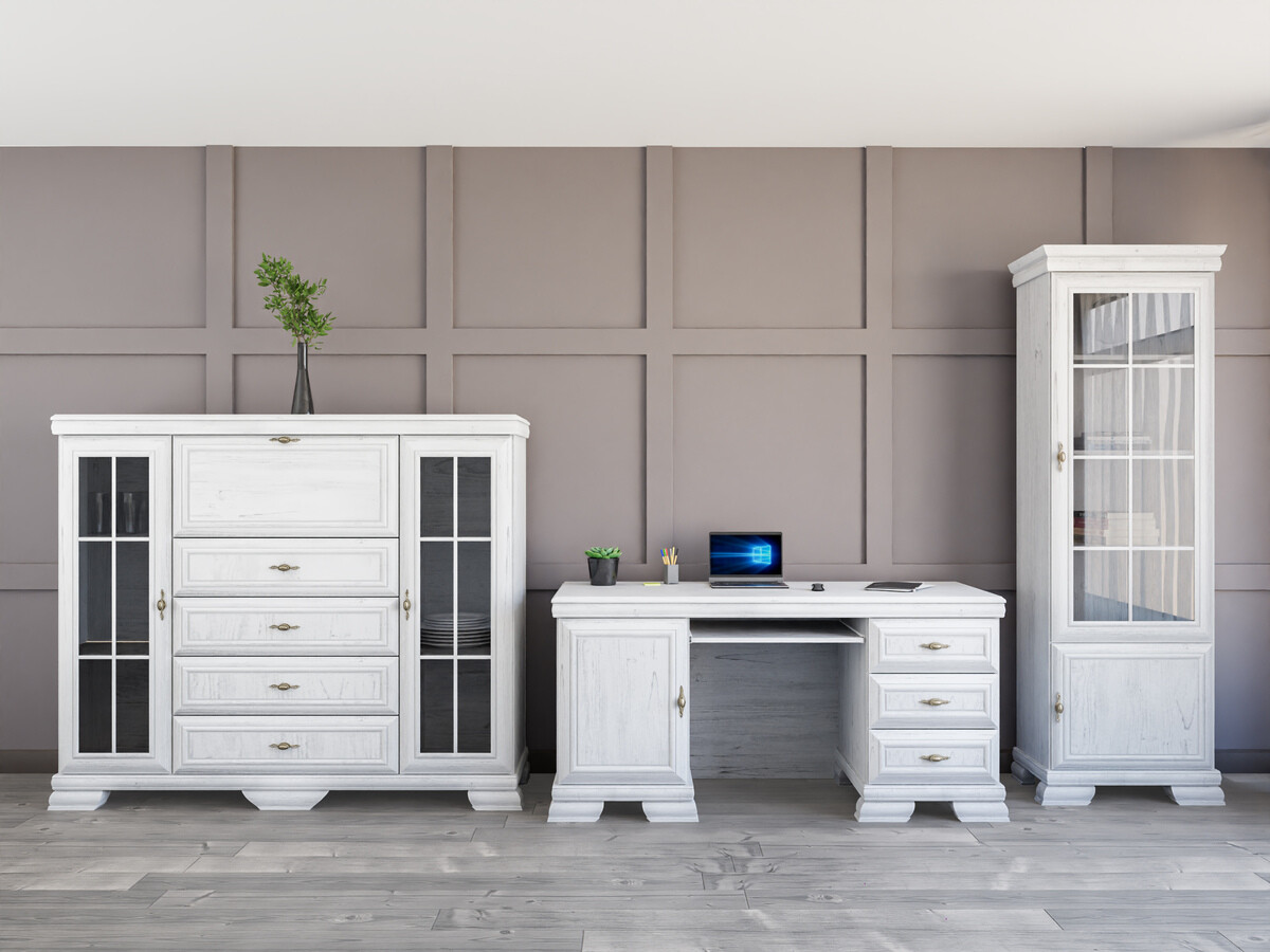 Diese Kollektion im klassischen Stil ist für diejenigen, die zeitloses Design und Eleganz schätzen. Die Möbel der Kollektion sind mit Metallgriffen in exklusivem Design verziert, die jedem Stück einen luxuriösen Akzent verleihen. Eines der wichtigsten Merkmale dieser Kollektion ist ihre kratzfeste Oberfläche, die die Langlebigkeit der Möbel gewährleistet. Selbst nach vielen Jahren kontinuierlicher Nutzung behalten diese Möbel ihr tadelloses Aussehen. Diese Kollektion strahlt nicht nur Eleganz aus, sondern legt auch Wert auf Funktionalität. Die Regale und Schubladen sind geräumig und sorgen dafür, dass Sie genügend Platz haben, um Dinge organisiert aufzubewahren. Die Kombination aus klassischem Stil und Funktionalität sorgt dafür, dass diese Kollektion nicht nur Ihr Interieur schmückt, sondern auch die Qualität Ihres täglichen Lebens steigert. Genießen Sie die Schönheit des klassischen Stils und bringen Sie zeitlose Eleganz in Ihr Zuhause.