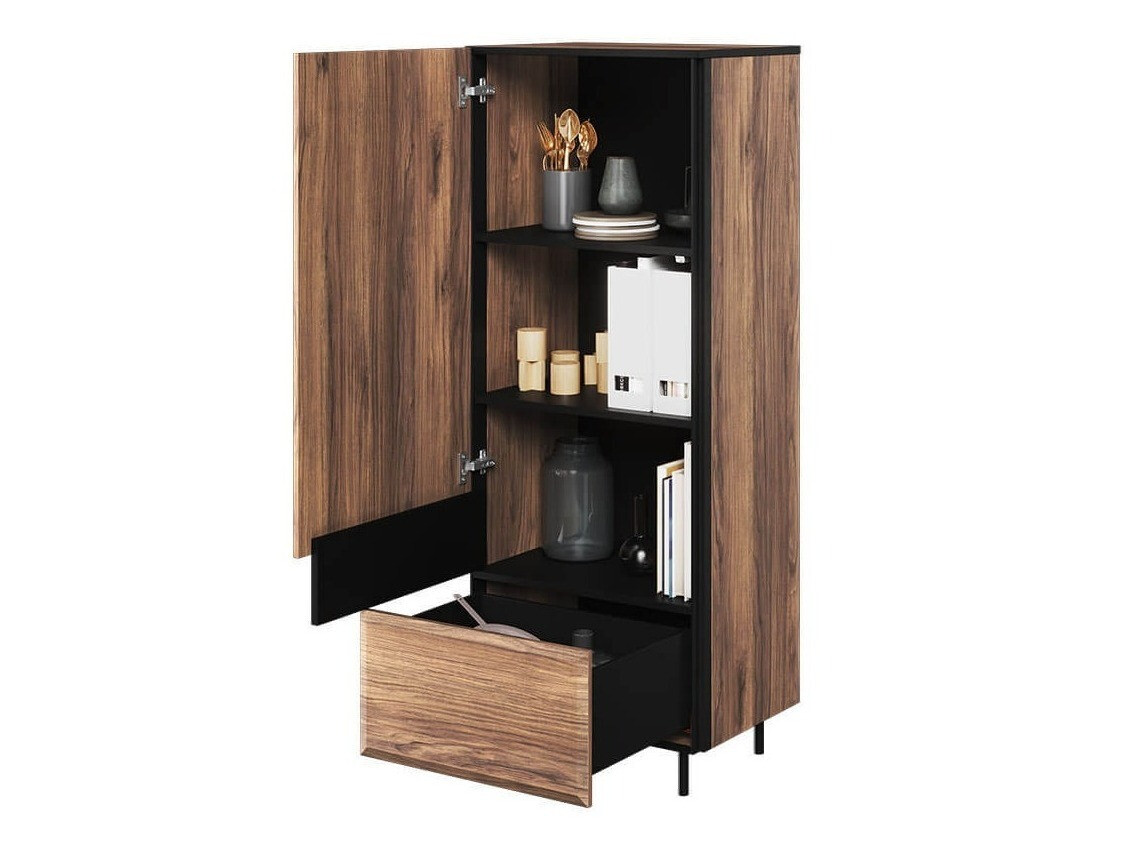 Ein Zuhause ist ein Ort, an den man sich immer wieder gerne zurückzieht. Achten Sie auf den wichtigsten Akzent des Hauses - die Möbel. Sie schaffen die gewünschte Stimmung und ermöglichen es Ihnen, Ihre Zeit zu Hause noch mehr zu genießen. Der Wohnraum hat viele Funktionen: Hier ruhen wir uns aus, treffen unsere Gäste und sehen fern. Vielleicht inspiriert Sie die Kollektion zu einer Veränderung? Wenn Sie die Kollektion sehen, fällt Ihnen das äußerst elegante Möbeldesign ins Auge. Die Kombination aus Schwarz und der Eichenholzoptik „Catania“ wirkt besonders luxuriös und verbreitet gleichzeitig Wärme und Gemütlichkeit. Die Fronten mit Holzdekor sind nicht mit unnötigen Details überladen, und die Metalleinfassungen erzeugen eine moderne Designatmosphäre. Die Linien und Silhouetten sind klar, aber nicht mit unnötigen Details überladen; alles fügt sich harmonisch in das Gesamtbild ein. Bei dem in den Vitrinen verwendeten gehärteten Glas handelt es sich um ein wärmebehandeltes Material, dessen mechanische Festigkeit 5-6-mal höher ist als die von normalem Glas. Zur Belebung der Vitrinen trägt eine LED-Beleuchtung bei, die Sie zusätzlich bestellen und in die Vitrinen integrieren können. Kleine Details, wie z. B. die Möbelbeine aus Metall, fügen sich perfekt in das Möbeldesign ein. Die Möbel haben einen eingebauten geräuschlosen Schließmechanismus, dank dem die Türen und Schubladen kurz vor dem Schließen gestoppt und langsam eingezogen werden, so dass kein Geräusch entsteht. Der „Push-to-Open“-Öffnungsmechanismus ermöglicht es, Türen und Schubladen mit nur einer Berührung zu öffnen.