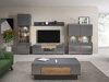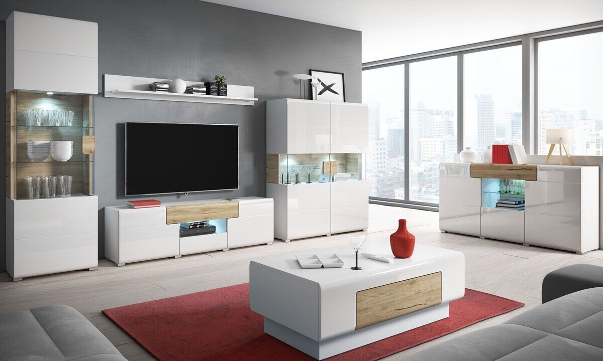 Die Möbelkollektion wurde für Personen geschaffen, die einfache und geometrische Möbel lieben. Einfache Formen heben sich durch trendige Farben und weiche Frontlinien ab. Der matte Möbelkorpus, kombiniert mit glänzenden Fronten und dem Eichenholzdekor „San Remo“, bildet eine sehr elegante Kombination und strahlt Raffinesse und Minimalismus aus. Die abgerundeten Kanten der Türen verleihen den Möbeln dieser Kollektion einen einzigartigen Charakter. Ergänzt wird das Ganze durch rechteckige Griffe und eine optionale energiesparende LED-Beleuchtung, die zusätzlich erworben werden kann.