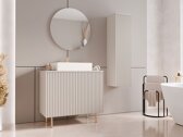 In der Innenarchitektur sind es oft die Details, die ein Gefühl der Einzigartigkeit vermitteln. Diese letzten Feinheiten verleihen einem Raum Charakter und tragen dazu bei, ein Haus in ein Zuhause zu verwandeln. Diese Möbelkollektion basiert genau auf diesem Prinzip. Hier wird subtile Eleganz mit durchdachter Funktionalität gepaart, sodass Sie einen einheitlichen und harmonischen Look in verschiedenen Bereichen Ihres Zuhauses schaffen können. Geriffelte und lamellierte Oberflächen verleihen dem Design Authentizität, während goldfarbene Metallgriffe und dezente Touch-Open-Funktionen an ausgewählten Möbelstücken für eine klare, einheitliche Ästhetik sorgen. Die hohen Metallbeine sind für Staubsaugerroboter ausgelegt, und eine Kombination aus offenen und geschlossenen Stauräumen sorgt für ein einfaches, organisiertes Wohnen. Diese Kollektion fügt sich mühelos in moderne, klassische Innenräume ein und wird zu einem subtilen, aber auffälligen Akzent im Zuhause.