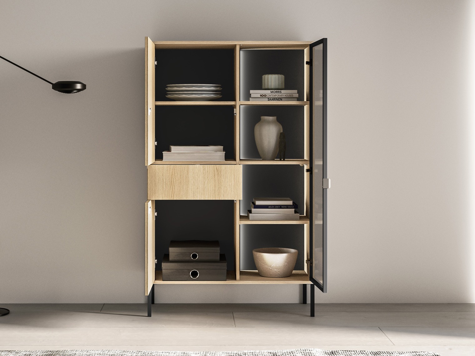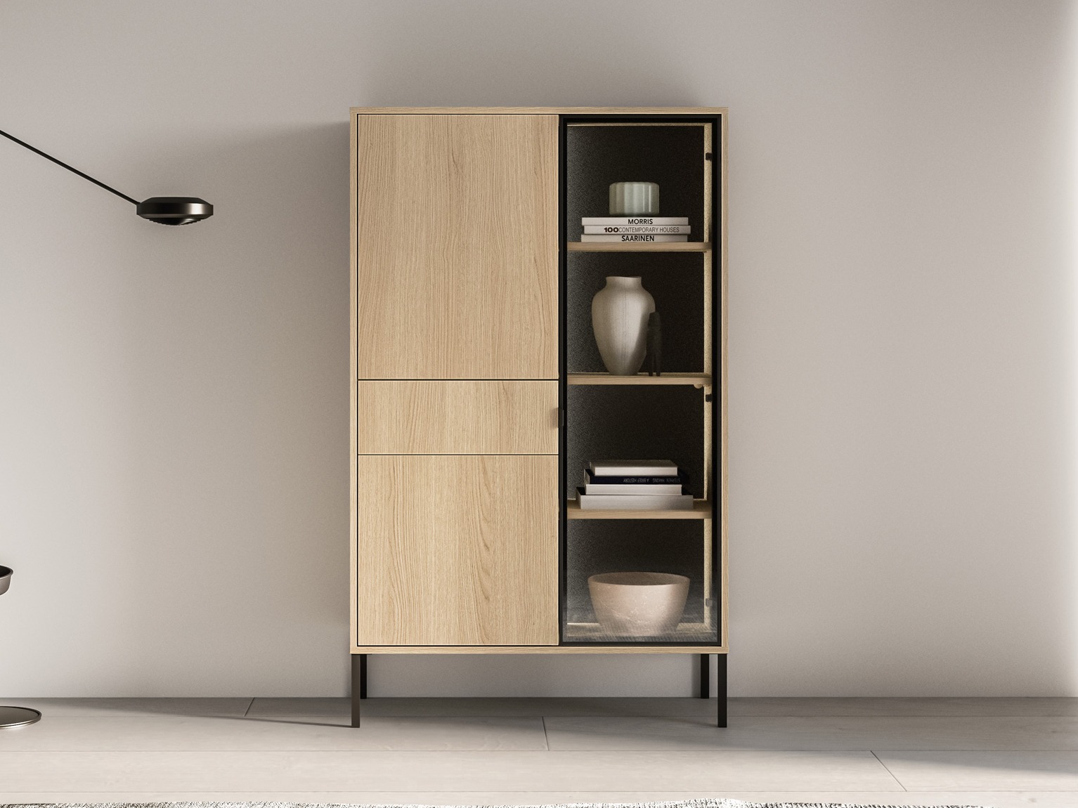 Diese Möbelstücke im zeitgenössischen Stil zeichnen sich durch ihre klaren Linien und ihre raffinierte Ästhetik aus, wodurch sie sich mühelos in Innenräume verschiedener Stilrichtungen einfügen. Minimalistische Griffe werden mit einem praktischen Druckmechanismus kombiniert, wodurch die Fronten optisch makellos und aufgeräumt bleiben. Ein integriertes Soft-Close-System garantiert ein langsames und sanftes Schließen von Türen und Schubladen. Die eingebaute LED-Beleuchtung in den Regalen sorgt für zusätzliche Wärme und Modernität, beleuchtet den Raum dezent und hebt die Designdetails der Möbel hervor. Sie ist eine ausgezeichnete Wahl für alle, die Möbel suchen, die Funktionalität mit elegantem Design verbinden.