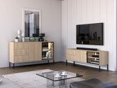 Diese Möbelstücke im zeitgenössischen Stil zeichnen sich durch ihre klaren Linien und ihre raffinierte Ästhetik aus, wodurch sie sich mühelos in Innenräume verschiedener Stilrichtungen einfügen. Minimalistische Griffe werden mit einem praktischen Druckmechanismus kombiniert, wodurch die Fronten optisch makellos und aufgeräumt bleiben. Ein integriertes Soft-Close-System garantiert ein langsames und sanftes Schließen von Türen und Schubladen. Die eingebaute LED-Beleuchtung in den Regalen sorgt für zusätzliche Wärme und Modernität, beleuchtet den Raum dezent und hebt die Designdetails der Möbel hervor. Sie ist eine ausgezeichnete Wahl für alle, die Möbel suchen, die Funktionalität mit elegantem Design verbinden.
