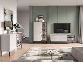 Diese Möbelstücke im zeitgenössischen Stil zeichnen sich durch ihre klaren Linien und ihre raffinierte Ästhetik aus, wodurch sie sich mühelos in Innenräume verschiedener Stilrichtungen einfügen. Minimalistische Griffe werden mit einem praktischen Druckmechanismus kombiniert, wodurch die Fronten optisch makellos und aufgeräumt bleiben. Ein integriertes Soft-Close-System garantiert ein langsames und sanftes Schließen von Türen und Schubladen. Die eingebaute LED-Beleuchtung in den Regalen sorgt für zusätzliche Wärme und Modernität, beleuchtet den Raum dezent und hebt die Designdetails der Möbel hervor. Sie ist eine ausgezeichnete Wahl für alle, die Möbel suchen, die Funktionalität mit elegantem Design verbinden.